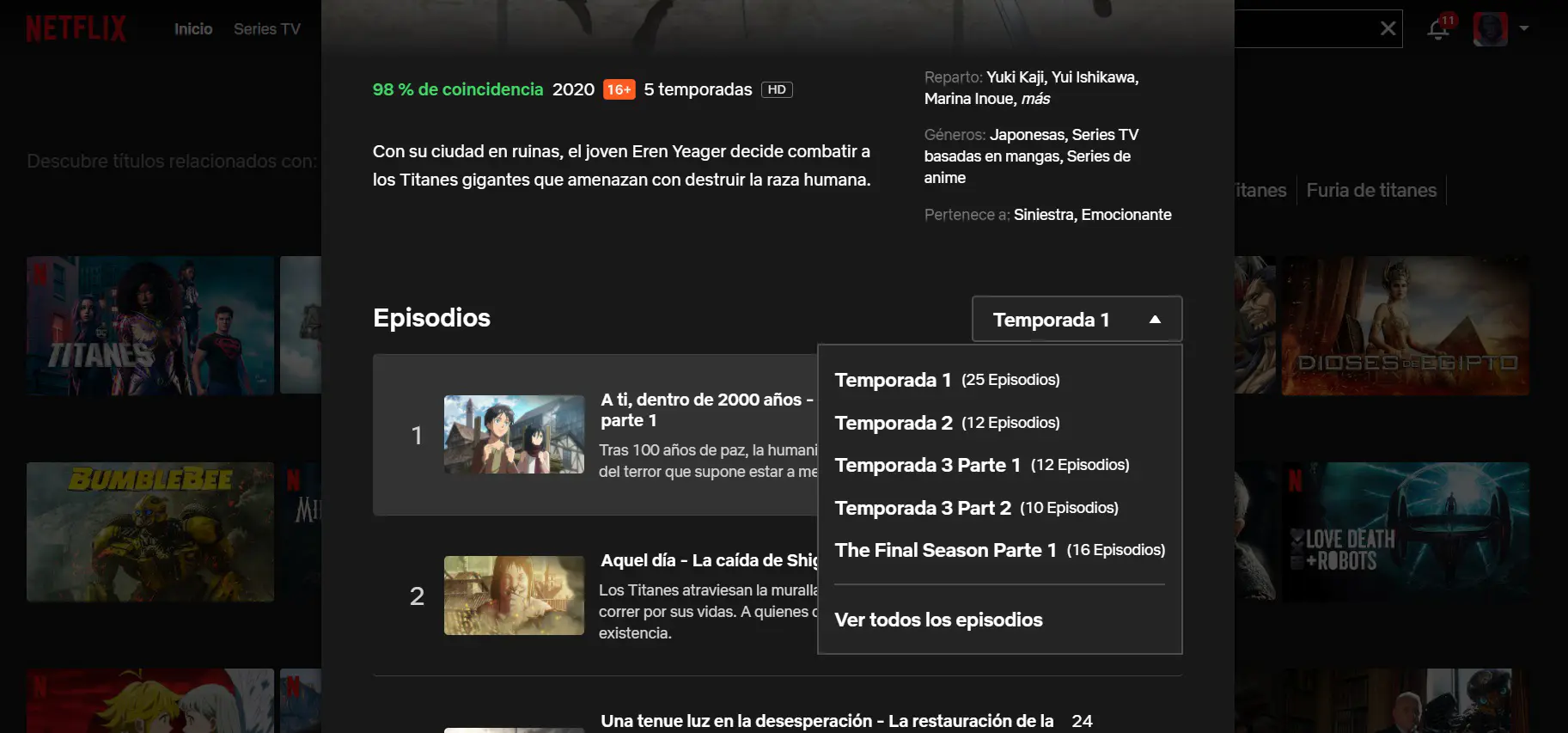 De una forma no tan completa como lo hace Prime Video, lo cierto es que Netflix también es una opción muy recomendable a la hora de ver el anime de "Shingeki no Kyojin". Si bien desde hace tiempo la cantidad de temporadas de la plataforma se había quedado estancada en la parte 1 de la temporada 3, con la llegada de 2023 la cosa ha ido a más. Ahora, también están disponibles la parte 2 de la temporada 3 y la parte 1 de la Temporada Final. ¿Qué quiere decir esto? Que seguramente eventualmente todo "Ataque a los Titanes" llegará a Netflix, pero paciencia.