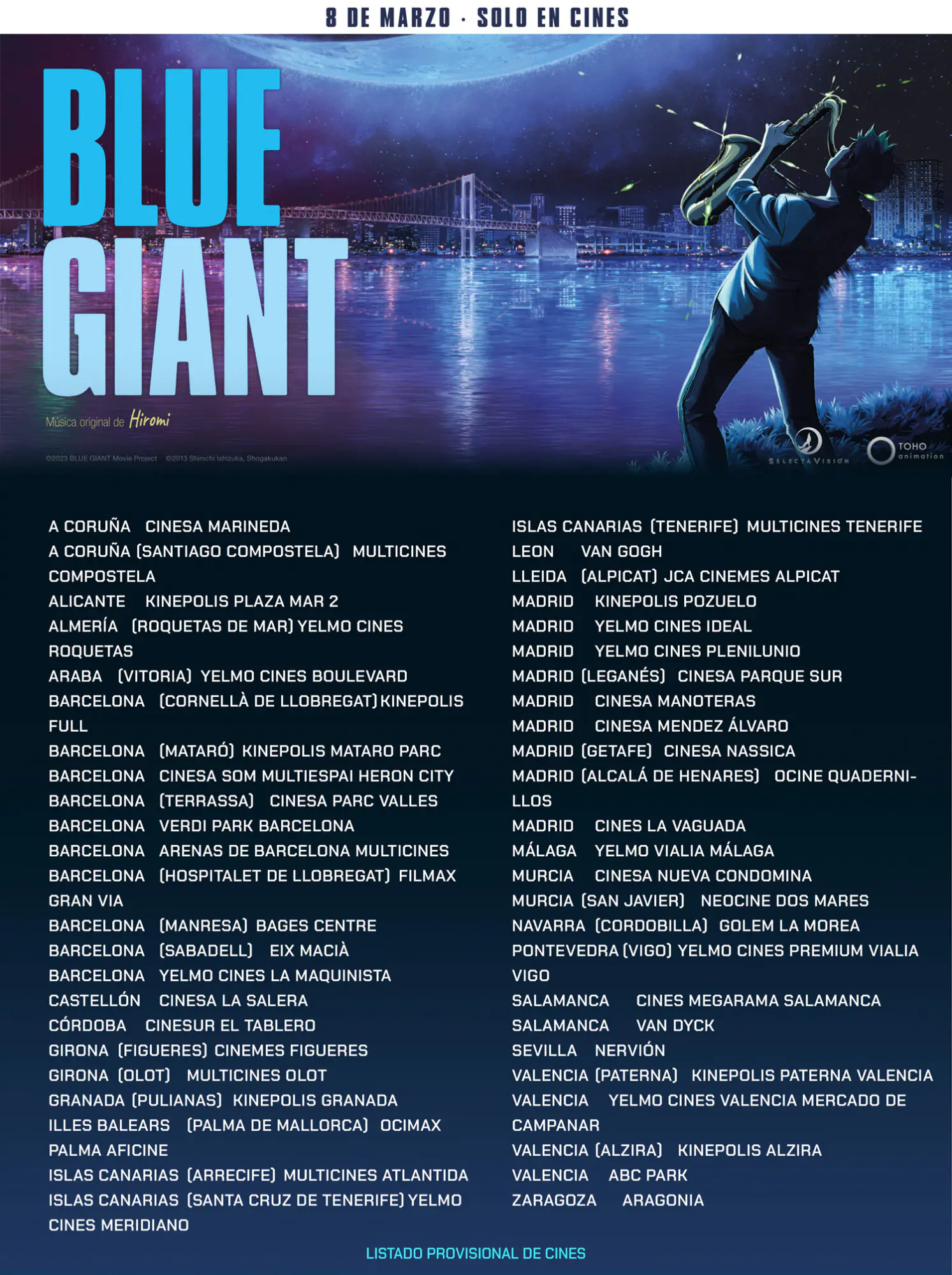 Por ello, hoy vengo a contaros en qué salas podremos ver "Blue Giant". Y es que Selecta Visión ha publicado el listado completo. Os lo dejo aquí mismo, y más abajo os recuerdo algunos de los detalles más importantes sobre este largometraje. ¡Vamos al lío!