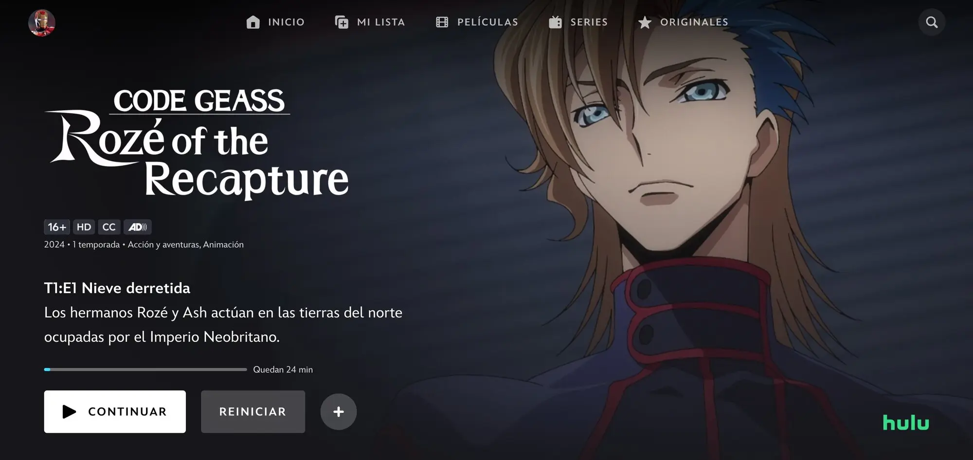 Por desgracia, este servicio no tiene nada de 'Code Geass: Lelouch el de la Rebelión'. No obstante, sí que alberga en su catálogo una serie de la franquicia. Siendo más concreto, Disney+ posee 'Code Geass: Rozé of the of the Recapture', un anime de 12 episodios con nuevos protagonistas que actúa como secuela del final alternativo de las películas de Lelouch. Por desgracia, NO cuenta con doblaje en castellano, aunque sí en otros idiomas como el español de Latinoamérica.