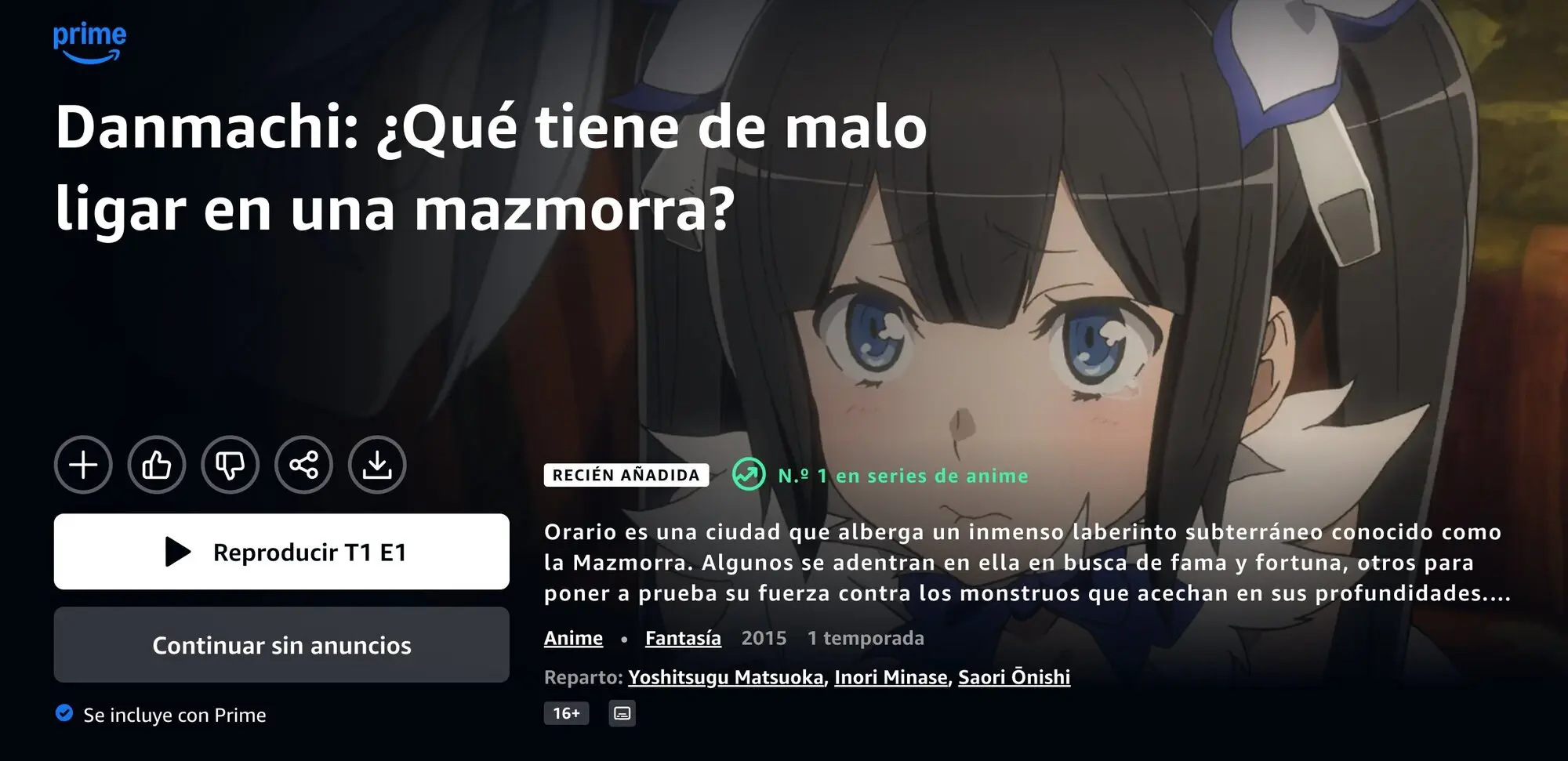 A fecha de redacción de este texto, Prime Video cuenta con la temporada 1 de DanMachi, disponible de nuevo tanto con doblaje como en VOSE. El hecho de que la acaben de añadir es importante, porque significa que con el tiempo podrían ir llegando el resto de temporadas e igualarse así a AnimeBox. No obstante, tampoco sería extraño si la plataforma de Amazon nunca llegara a acoger este anime al completo.