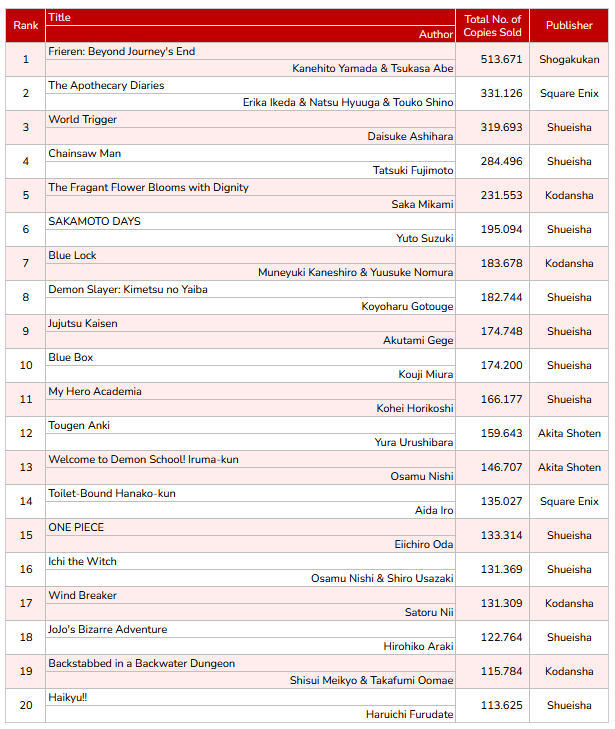 Como puede verse, "Frieren" y "Los diarios de la boticaria" ocupan los dos primeros lugares en la venta de manga mensual de Japón. Especialmente notable es el rendimiento de "Frieren", que con medio millón de ventas es la única obra que logra romper la barrera de las 300.000 copias vendidas en las últimas cuatro semanas.