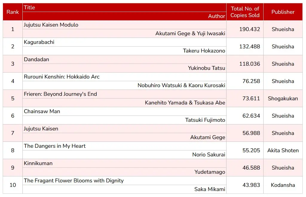 Desde @WSJ_manga recogieron las ventas de manga del 5 al 11 de enero de 2026 que se produjeron en Japón, las cuales coincidían justamente con la semana de lanzamiento del primer volumen físico de "Jujutsu Kaisen Modulo". Así ha quedado la cosa: