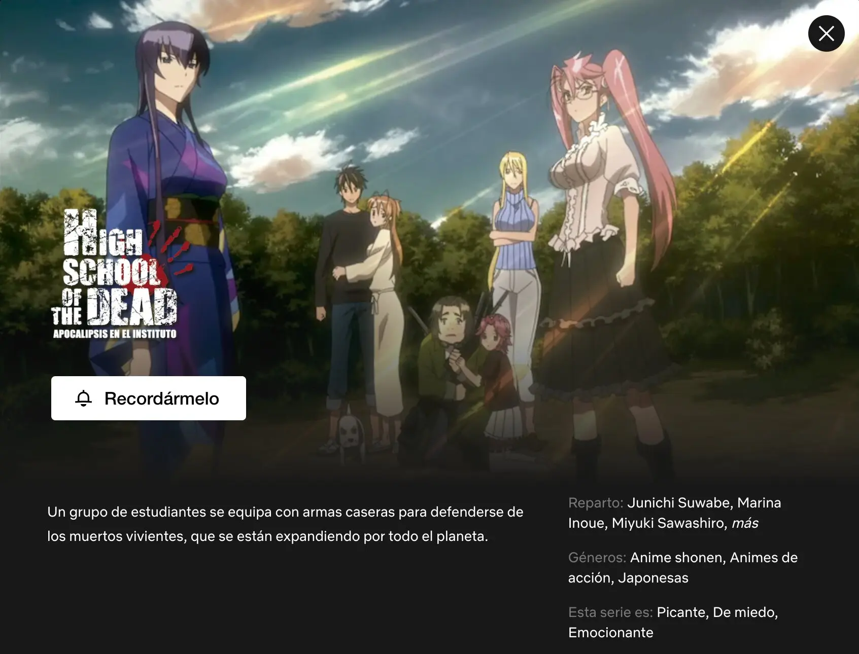 Dicho de forma clara y directa: 'High School of the Dead' no está disponible en Netflix. Como podéis ver en la imagen que dejo a continuación, el anime cuenta con una ficha en la plataforma, aunque no se puede acceder a sus episodios. Siempre cabe la posibilidad de que esté disponible en el futuro, aunque quizás sea más improbable que otros casos debido a que se trata de una serie algo antigua que no tuvo continuidad.