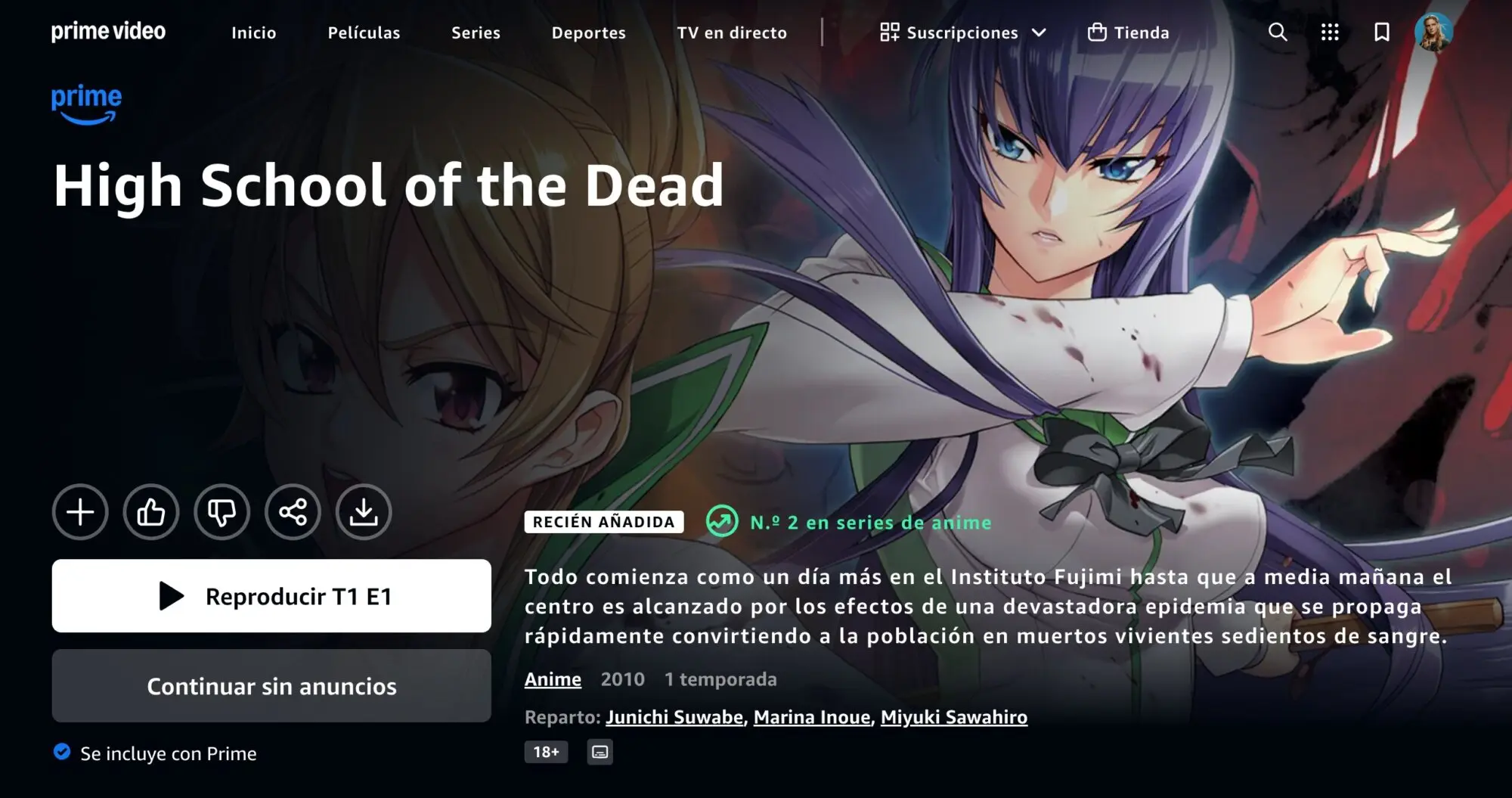 Esta es otra buena opción, ya que Prime Video también tiene High School of the Dead en su catálogo. Es normal que la plataforma de Amazon acoja algunas de las licencias más destacadas de Selecta Visión, por lo que no es algo especialmente sorprendente. Eso sí, en este servicio no hay ni rastro de la OVA, aunque lo que sí se mantiene es el doblaje en español y la opción de verlo en VOSE.