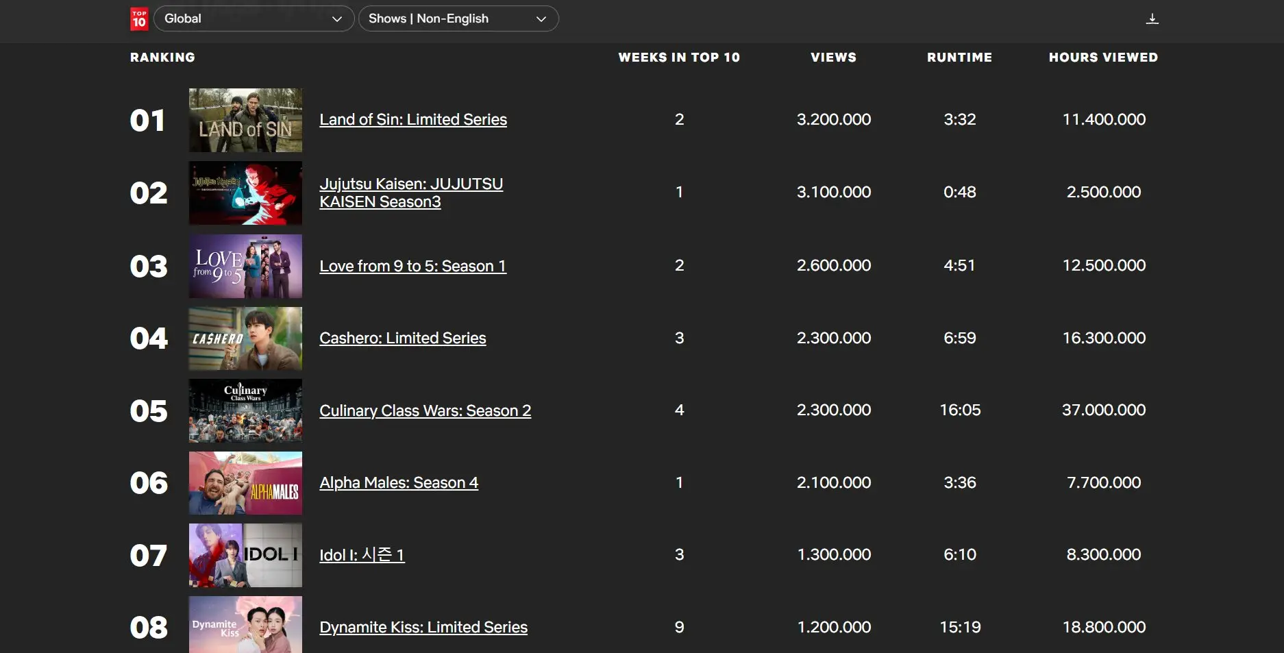 Seguidamente os dejo con el Top 8 Global de contenidos no ingleses de Netflix en esta última semana: