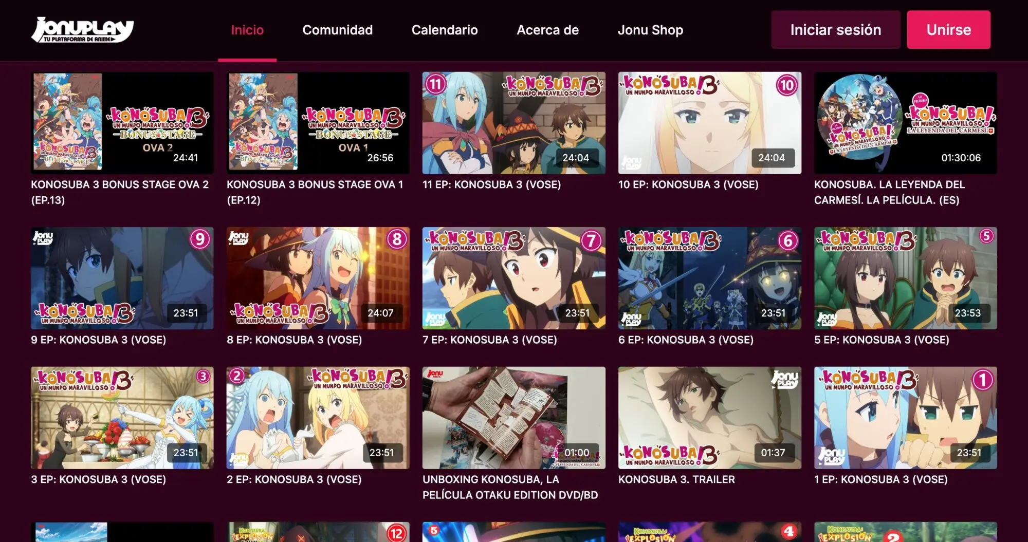 La distribuidora de KonoSuba en España es Jonu Media, que también cuenta con su propia plataforma, Jonu Play. Estamos hablando de otra gran opción, pues cuenta con TODO el contenido de este anime en su catálogo. Tanto la serie principal como la película y el spin-off de Megumin se encuentran incluidos en este servicio.