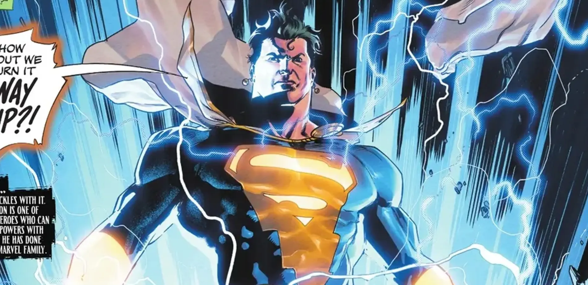 Lo que habéis podido ver ocurre en el tomo número #3 de la línea de cómics DC KO, y es el resultado de que Superman una fuerzas con Shazam. En esta línea de cómics tienen lugar múltiples batallas por equipos con famosos superhéroes de DC, y justamente uno de los equipos es el formado por Superman y Shazam.