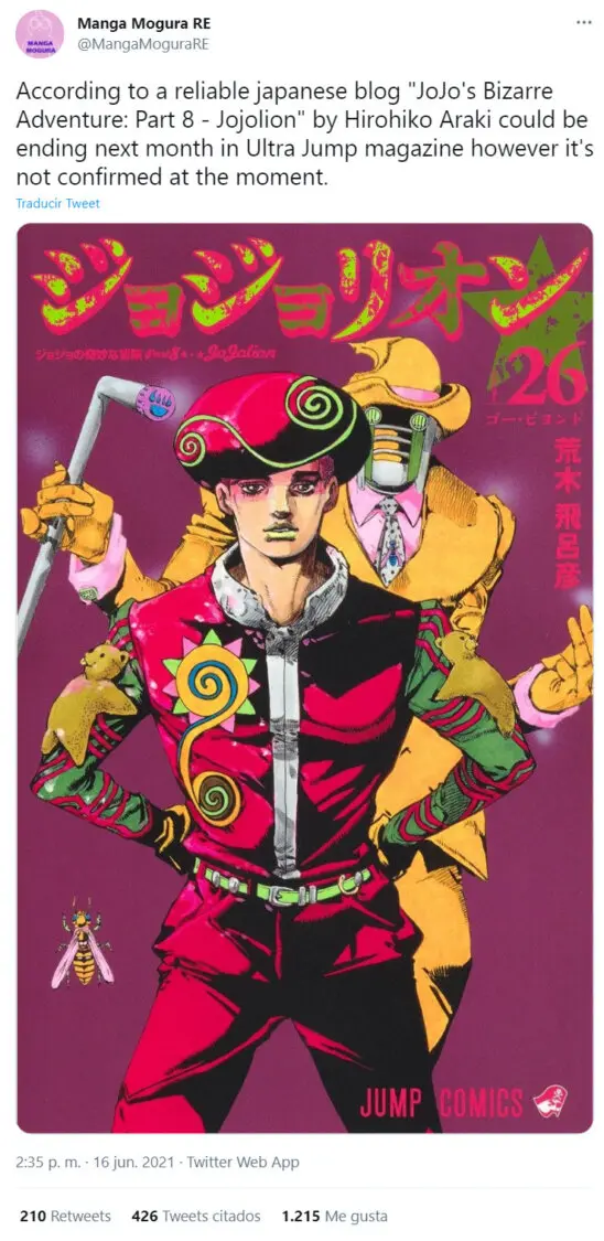 Según MangaMogura, un blog japonés ha indicado que la parte 8 de "Jojo's Bizarre Adventure" concluirá tan pronto como durante el próximo mes de julio. Esta es una posibilidad que, por otro lado, se ha encontrado con muchos detractores rápidamente, pues al parecer la historia no ha avanzado hasta el punto en el que Araki-sensei parece realmente determinado a decir 'hasta aquí'.