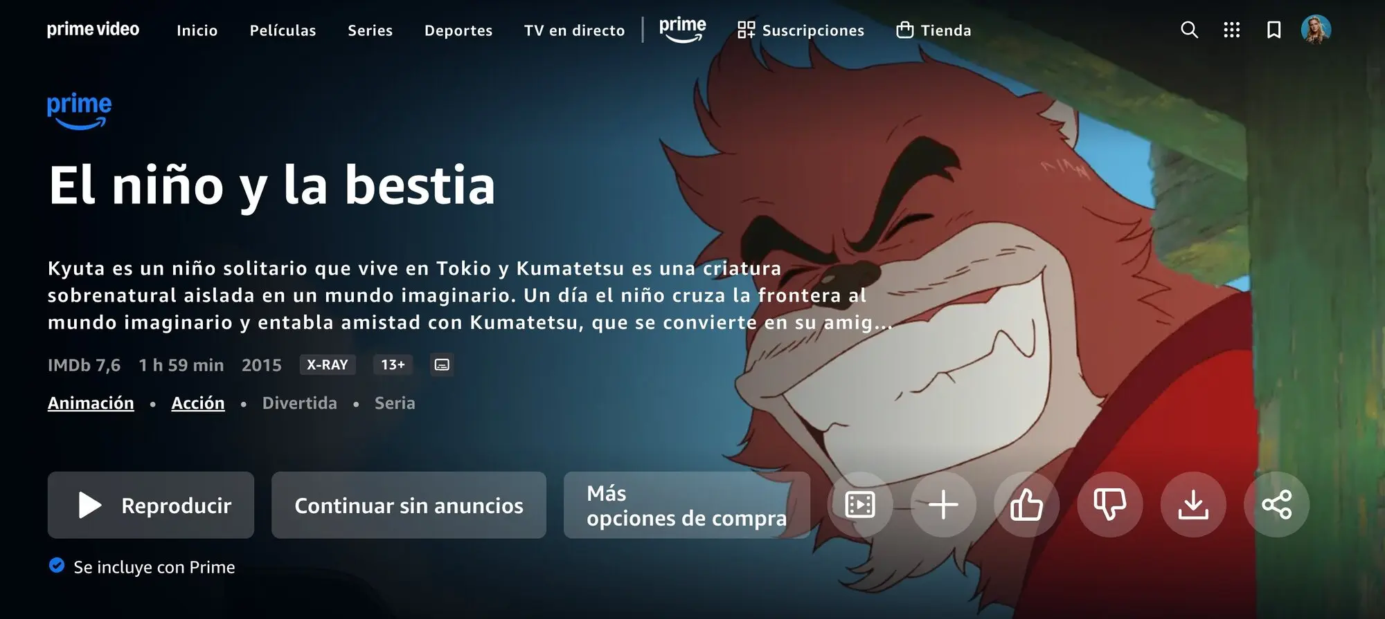 La plataforma de Amazon cuenta con bastante anime, por lo que no creo que os sorprenda demasiado si os digo que tiene incluida en su catálogo 'El niño y la bestia'. Es una pena que no tenga una variedad mayor de las películas del director, pero menos es nada. Hace tiempo también tuvo Belle, pero actualmente no se encuentra disponible. Por ello, no hay que descartar a llegada de nuevos largometrajes de Hosoda a este servicio en el futuro.