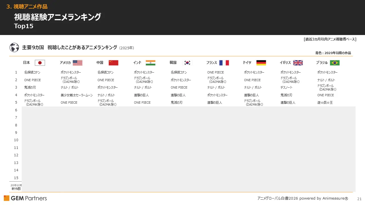 El medio PRTimes ha compartido un gráfico en el que se pueden apreciar los animes que más se vieron durante el pasado 2025. Lo más sorprendente es que ni "Jujutsu Kaisen" ni "Kimetsu no Yaiba" dominaron en uno solo de los países revisados: