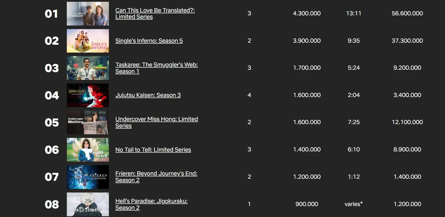 Lógicamente, el anime que más impacto está teniendo en las visualizaciones de Netflix es "Jujutsu Kaisen" con su tercera temporada. La obra de Gege Akutami es carne de fenómeno mundial y ya es un show del que millones están constantemente pendientes para descubrir cuándo llegan nuevos episodios y temporadas.