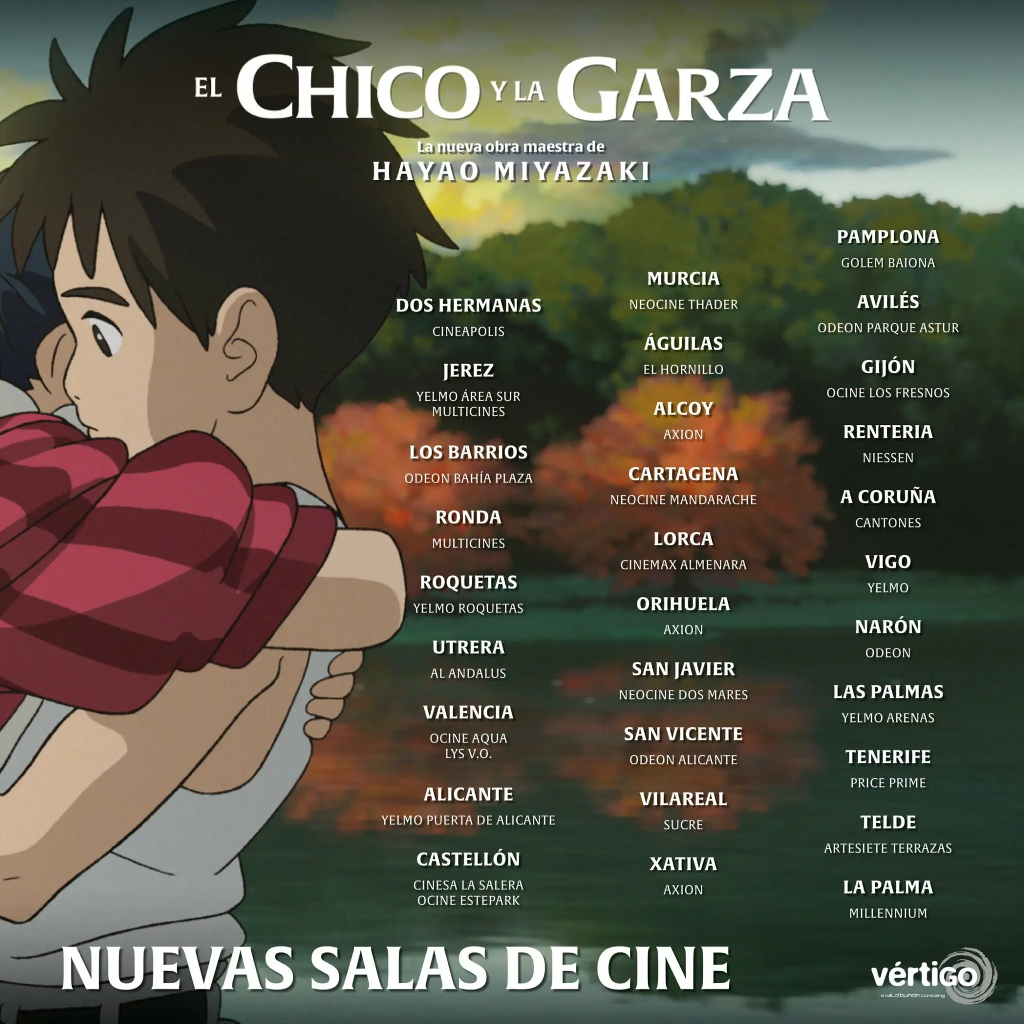 Siendo más concreto, "El chico y la garza" ha conseguido duplicar el número de salas en las que se exhibe, según ha compartido Vértigo Films. A continuación, os dejo un listado de los nuevos cines en los que se proyecta la cinta. Espero que tengáis suerte y haya alguno cercano a vuestra casa.
