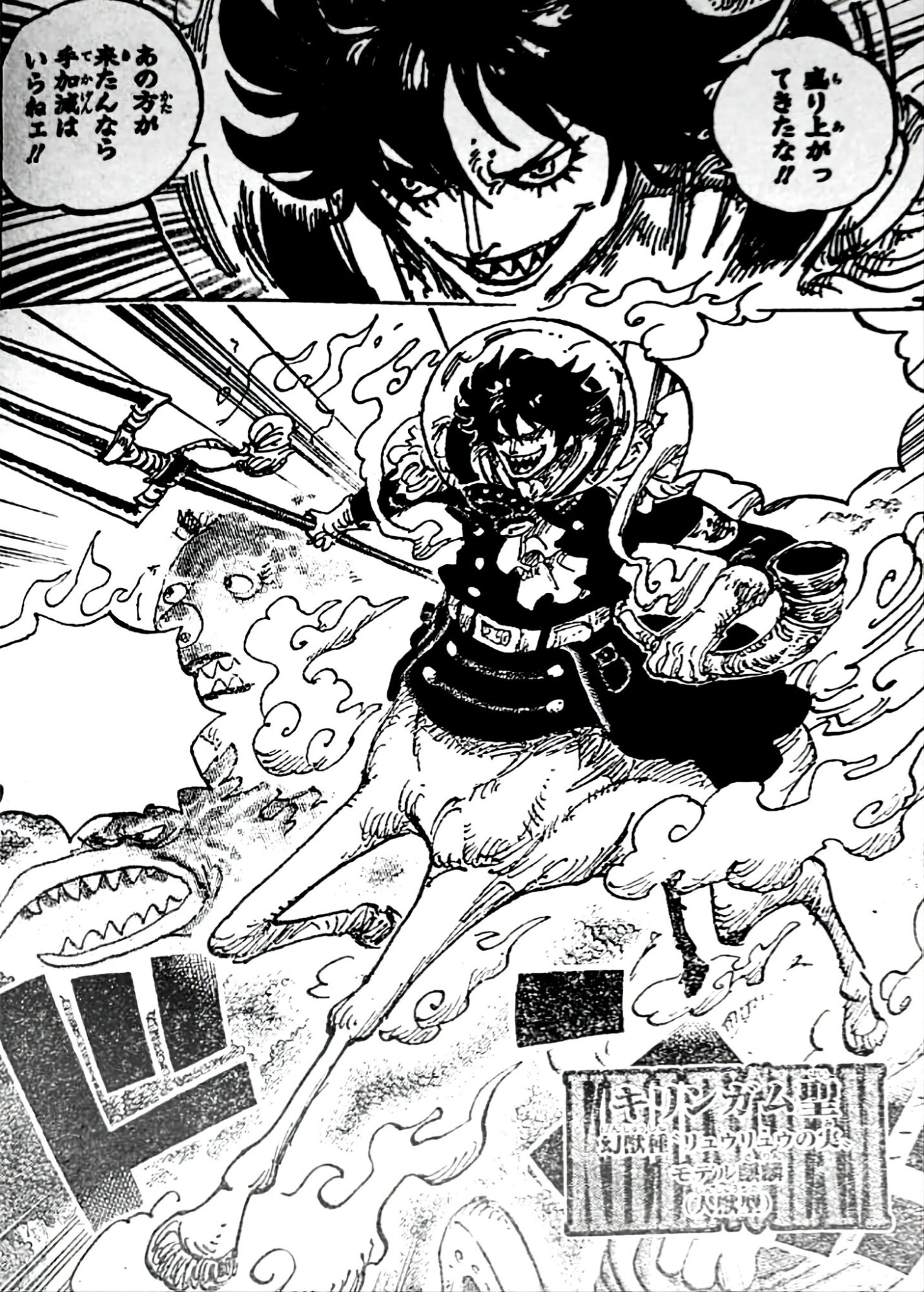 En las últimas horas han comenzado a surgir diversas imágenes filtradas del nuevo capítulo de 'One Piece', y en una de ellas se muestra una viñeta en la que Killingham adopta su forma híbrida. Con esta transformación, el Caballero Sagrado se convierte en un centauro (la parte superior de su cuerpo es humana, la inferior es de Qilin) y luce un rostro humano que recuerda ligeramente al de Hody Jones, con colmillos, largas pestañas inferiores y pelo más corto.
