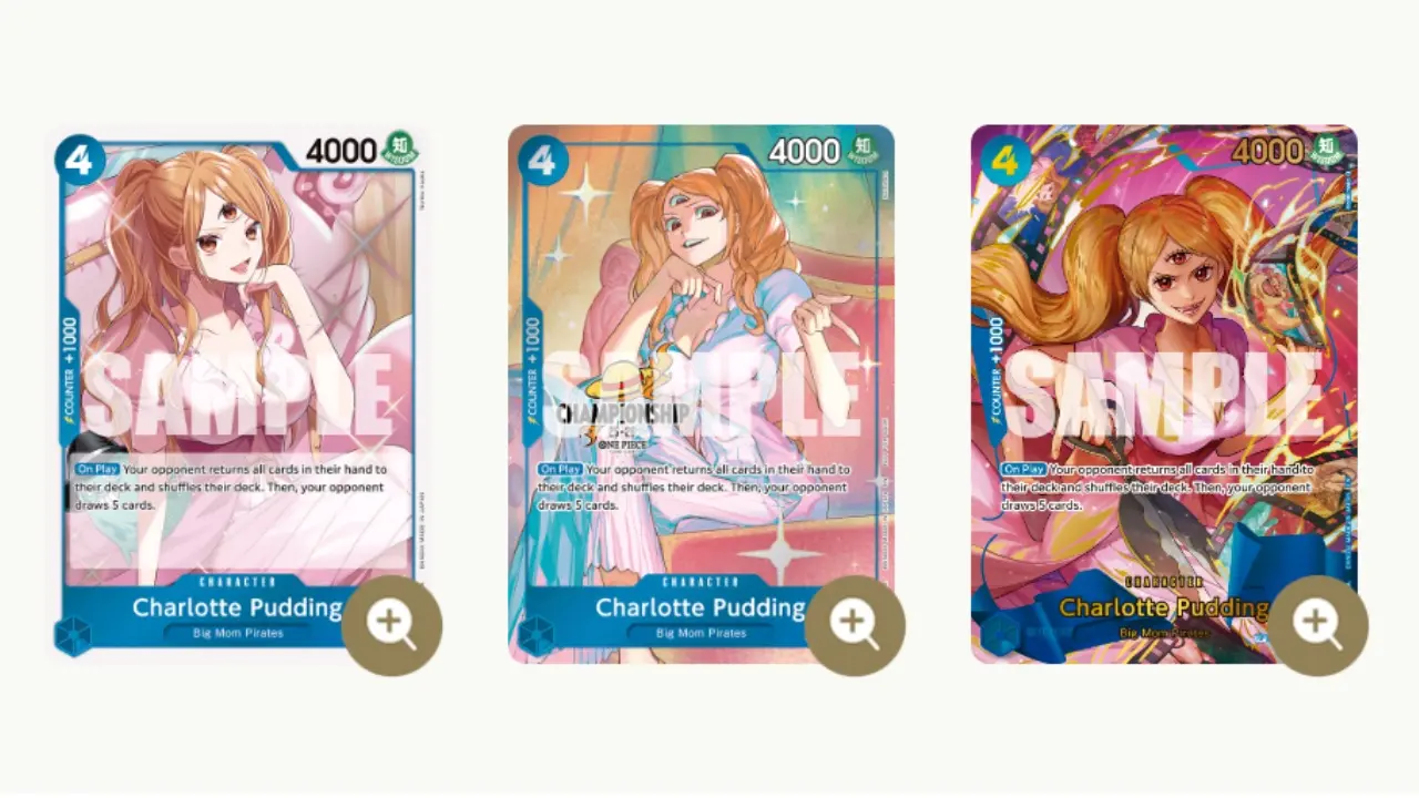 La carta OP06-047 Charlotte Puding pasa a estar prohibida, por lo que no podrá incluirse en ningún mazo durante competiciones oficiales. Hasta ahora, esta carta se utilizaba bastante en mazos azules como respuesta contra rivales con muchas cartas en la mano. No obstante, los responsables de One Piece TCG creen que rompe el componente estratégico basado en gestionar y leer el número de cartas en la mano del rival, uno de los aspectos clave del juego. Por esa razón, han decidido banearla por completo.