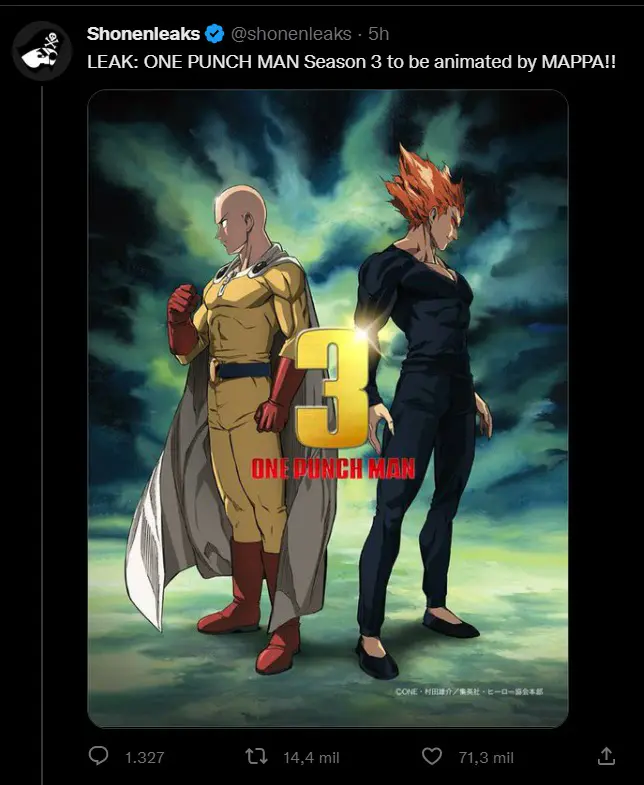 Seguidamente os dejo con el tuit de la mano de ShonenLeaks, uno de los insiders de nombre más recurrente en el sector del anime, según el cual será el estudio de moda el que se encargue precisamente de hacer que Saitama, Genos y demás vuelvan a brillar en "One Punch Man":