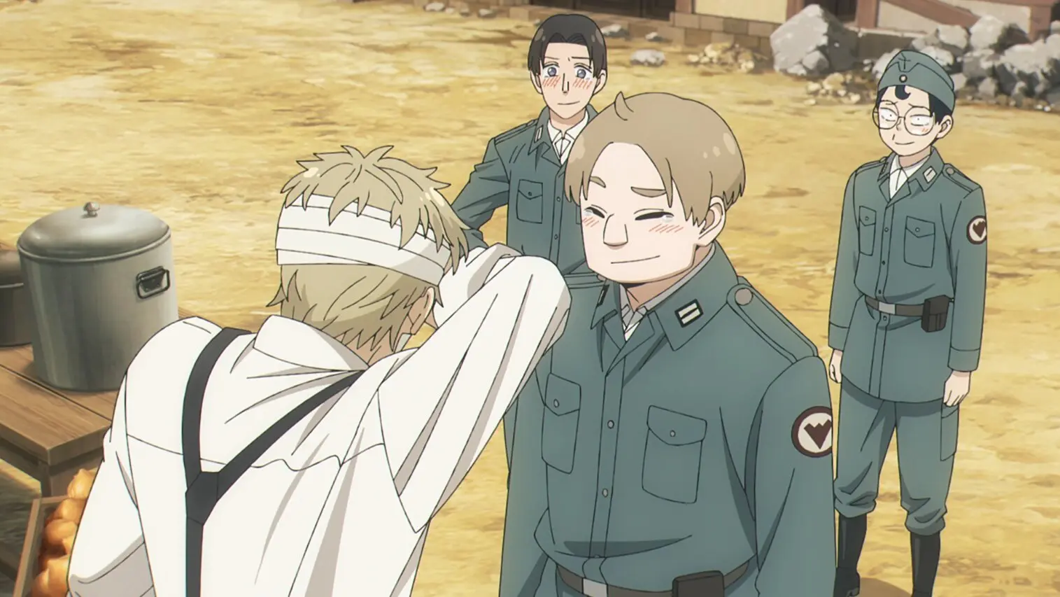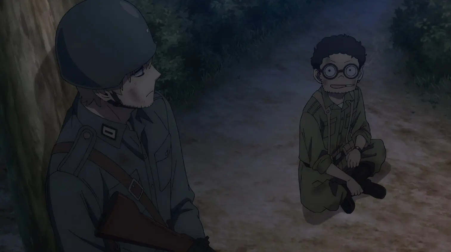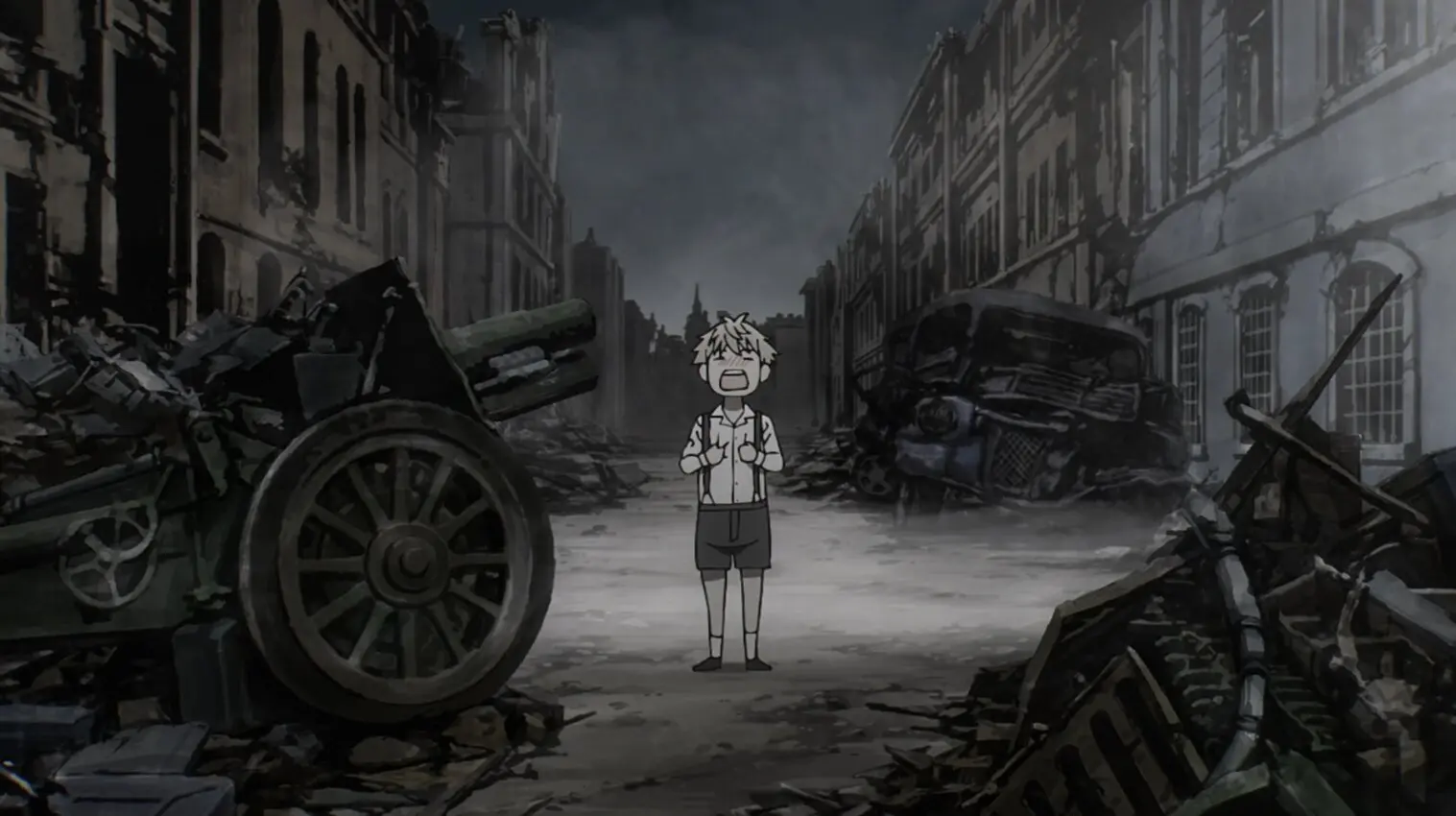 Precisamente es una conversación con la dueña de la carnicería lo que hace cambiar al Comandante su punto de vista. Esta le cuenta a nuestro joven protagonista que las guerras son una tontería, y que ella tiene familia en Ostania que no son monstruos ni nada por el estilo, sino personas normales como los de Westalis. Esta charla cala hondo en el corazón del Comandante, que está decidido a pedirle perdón a su padre por el engaño y a decirle a sus amigos que jueguen a otra cosa.