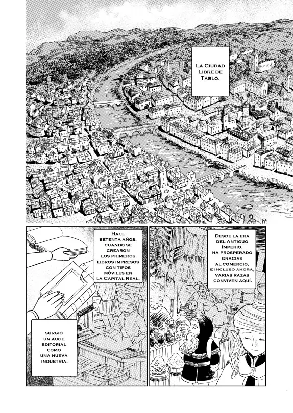 Por ello, @editorO8823, un editor de la empresa Kadokawa, se ha tomado la molestia de lanzar una traducción inicial de "Spica y la voz de los libros" (en japonés '本聴きのスピカ') a través de 'X'. El primer capítulo de la historia, que gira en torno a una elfa que sueña con ser encuadernadora, puede leerse al completo en este hilo, pero os dejo seguidamente una muestra del trabajo: