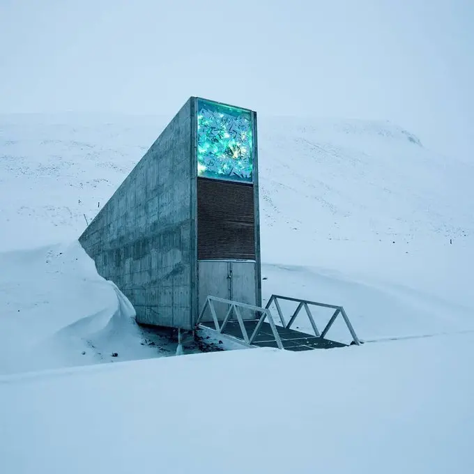 Este búnker cerrado de forma completamente hermética se encuentra ubicado en Svalbard, Noruega. Se trata de una bóveda que contiene 100 millones de semillas de todo el mundo. El objetivo es conservarlas para usarlas en caso de que haya un apocalipsis mundial y con ello tener alimentos vegetales en ese caso. El búnker está diseñado para resistir incluso un desastre nuclear y se encuentra ubicado a una gran altura sobre el nivel del mar.