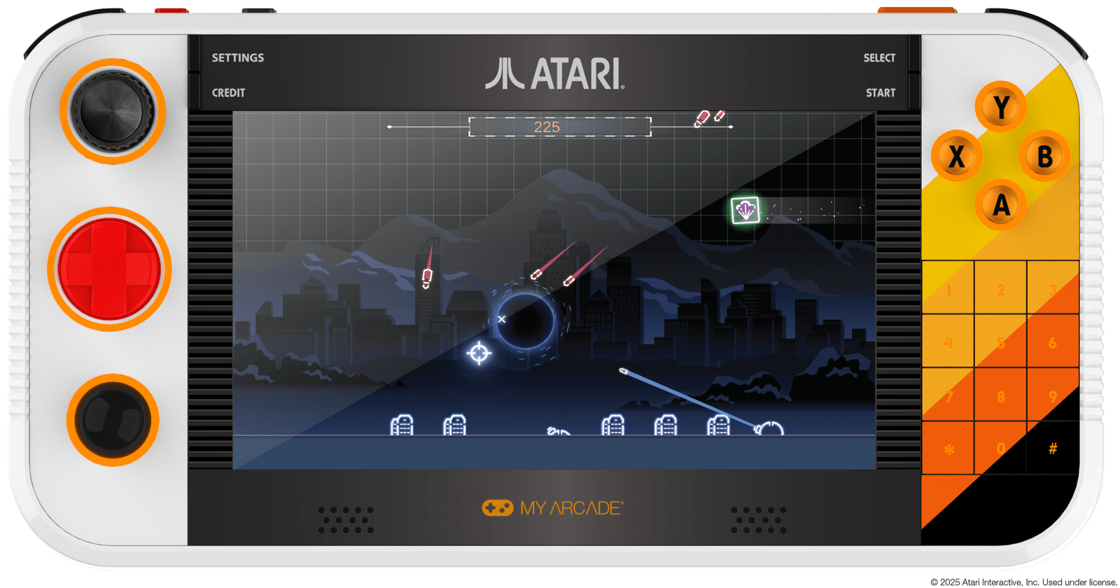 La bola de seguimiento está abajo a la izquierda y tío, jugar a Centipede o Missile Command con bola de seguimiento es la leche. Es pequeña y a veces es demasiado sensible, pero una vez te acostumbras funciona genial. Poder jugar a estos clásicos con los controles originales en un handheld es algo que no se ve todos los días.