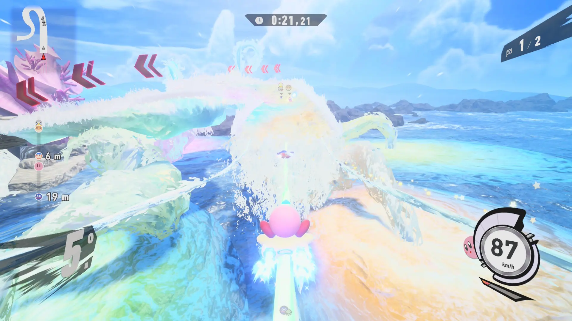 A todo esto hay que sumar, además, la existencia de powerups obtenidos al absorber enemigos, objetos que podemos encontrar tirados por ahí e incluso la existencia de distintos tipos de naves cuyas características estructurales hacen que funcionen de manera tajantemente diferenciada. Todo ello sin contar que cada personaje tiene una serie de estadísticas diferentes al resto, haciendo que el diseño jugable de Kirby Air Riders se conforme como un conjunto de capas superpuestas que van sumándose entre sí.