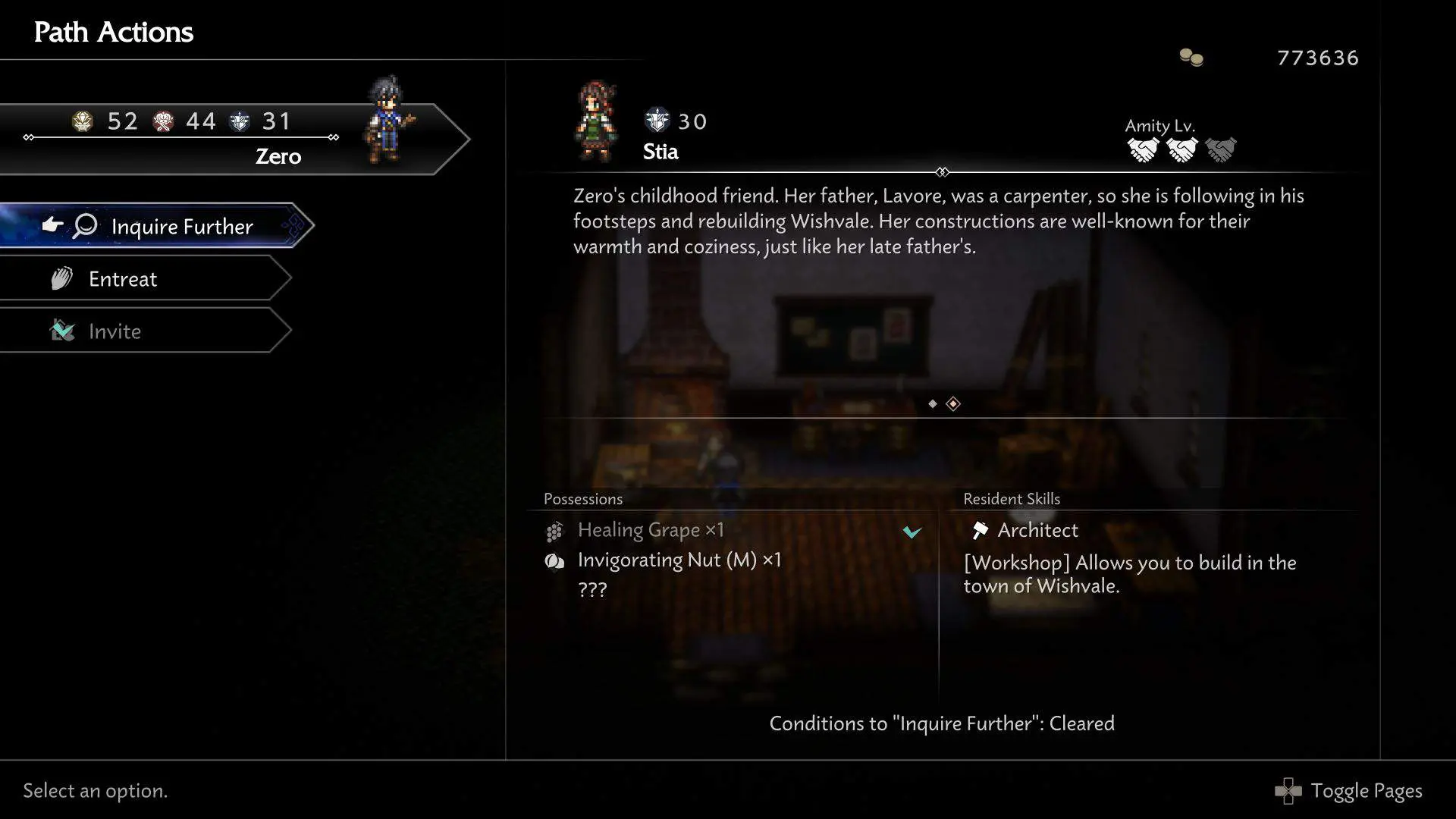 Además, no es cuestión simplemente de que se vea como una tarea entretenida a nivel de gameplay, es que ves que realmente construir la villa es importante para los personajes principales. Tiene unas implicaciones emocionales que puedes sentir constantemente. Por ello, explorar el mundo de Octopath Traveler 0 (hacerlo detenidamente te llevará más de 70 u 80 horas, dependiendo de cada uno) te otorga una doble satisfacción: la del viajero que descubre nuevas ciudades, montañas, bosques y cuevas, y la del trágico héroe que quiere recuperar la vida que una vez tuvo.