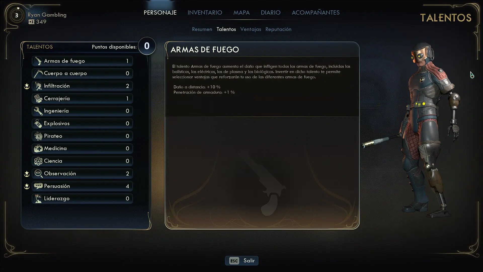 En esa misma línea, tampoco puedo pasar por alto las llamadas flaquezas: característicasque se presentan, en función de tus acciones, como defectos de tu personaje. Además, el juego mantiene el nivel de personalización de armas y equipos, permitiéndote añadir diversas pasivas para moldearte a diferentes enfrentamientos. Cada uno de esos elementos me permitieron dar forma a mi protagonista, cuya fortaleza estaba enla Persuasión y la Observación, además de tener una fuerte tendencia a la ludopatía. Esto es un simple ejemplo de las diferentes opciones que ofrece The Outer Worlds 2.