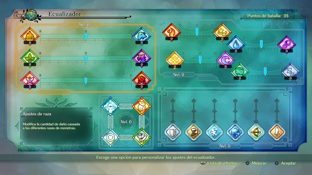 Cada vez que subimos de nivel, recibimos una cantidad de puntos variables para distribuir en cuatro apartado distintos. El primero llamado Ajustes de raza, nos permite calibrar el daño que hacemos a las seis clases de monstruos que nos encontraremos; dragones, reptiles, humanoides, etc. Estas aparecen emparejadas de dos en dos en unas reglas que nos obligan a elegir una u otra en cada caso. Por ejemplo, si nos hacemos más poderosos frente a las criaturas de la naturaleza, quizás nos estemos haciendo más débiles frente a los humanoides.