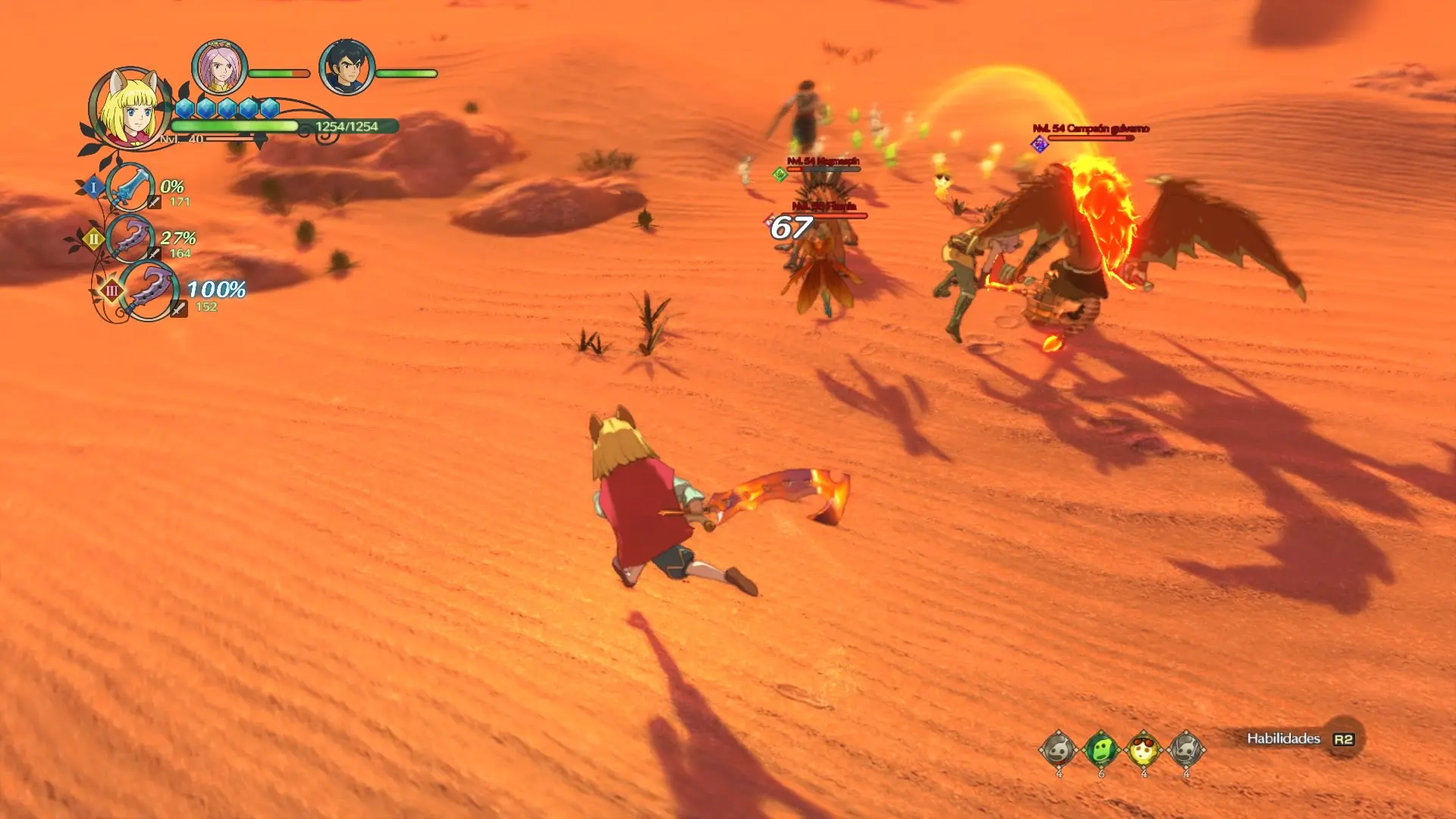 Puedo hablar de las muchas cosas que cambian en Ni no Kuni II -pocas son las que no lo hacen- pero es imposible hacerlo sin antes empezar por lo más importante. Una de las principales, por no decir la más importante mecánica de la primera entrega, era la recolección y entrenamiento de las criaturas llamadas Únimos. Estos seres con nombres propios y estéticas distinguibles, se llevaban de tal forma el protagonismo, que durante los combates no teníamos que reparar en nada más que en actuar como un entrenador Pokémon con ellos. Ahora todo eso desaparece para convertir a los protagonistas en una suerte de apoyos estratégicos.