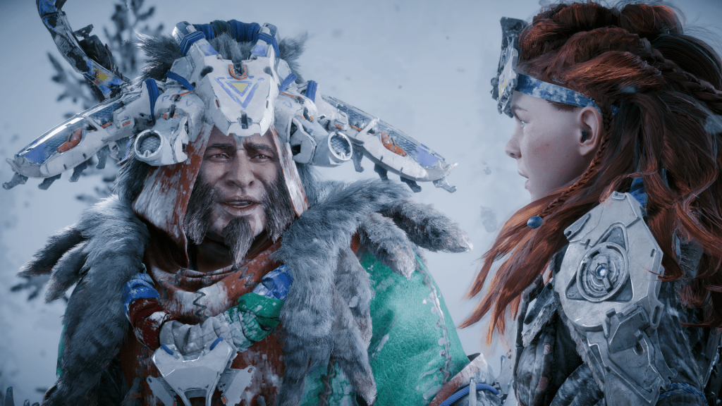 Si bien es cierto que, al igual que en el juego base, los diálogos están bien construidos y los personajes se sienten reales, las historias que se nos presentan en The Frozen Wilds no resultan tan trascendentes. Desde luego están bien construidas y son interesantes, pero se nota que son casi como una excusa para darnos a probar de la exquisita fórmula jugable que Guerrilla Games ha sabido crear. A pesar de ello, hay detalles muy interesantes en The Frozen Wilds, los cuales provienen de la tribu Banuk, que protagoniza la expansión y que, debido a sus estrictas normas de conducta (basadas en la tradición) nos ofrece personajes con una moral que se debate entre el deseo individual y la presión de todo el colectivo.