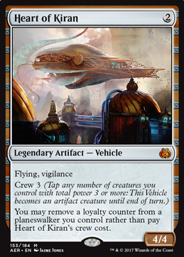 -Corazón de Kiran: Otro de los grandes vehículos de la expansión, por 2 manás tendremos un vehículo con vigilancia y que vuela, encima si tenemos un Planeswalker podremos usarlo para pagar su coste de tripular.