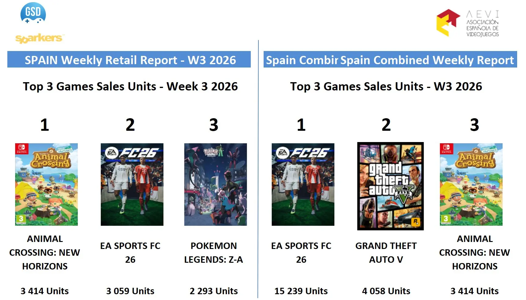 En segunda posición en retail encontramos EA Sports FC 26, que suma 3.059 copias físicas, manteniendo un rendimiento sólido tras la campaña navideña. El podio lo completa Pokémon Leyendas: Z-A, con 2.293 unidades, confirmando que la franquicia Pokémon continúa mostrando una fuerte tracción en tiendas físicas incluso semanas después de su lanzamiento.