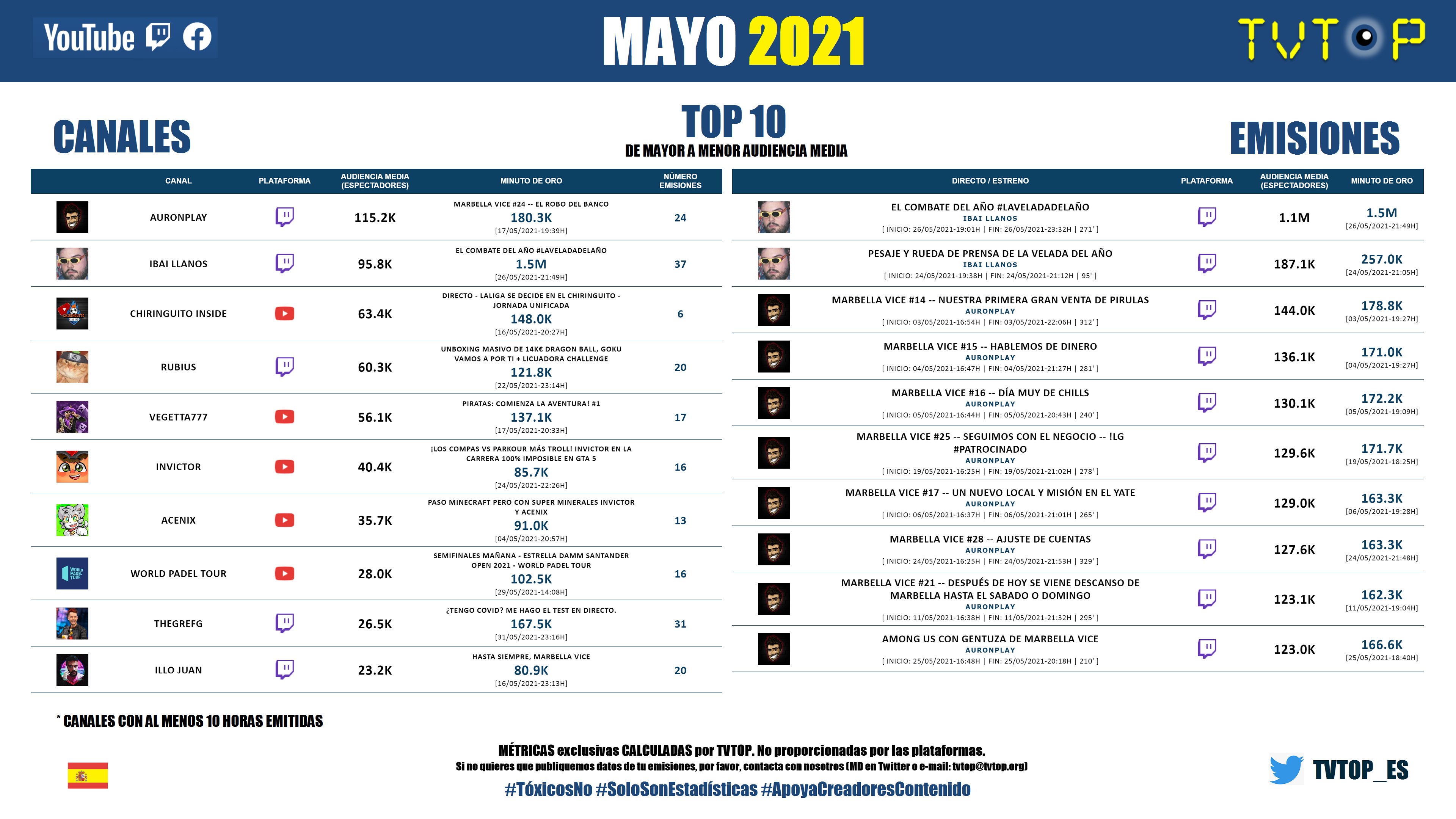 Muy pocos se sorprenderán de ver a Auronplay e Ibai liderando el listado, ya que el primero continuó aglomerando a más de 100 000 personas incluso con sus emisiones más discretas, y el segundo fue el artífice de organizar la Velada del Año, una exhibición de boxeo que reunió a 1,5 millones de personas delante de las pantallas. Otra disciplina deportiva que se coló en el top fue el World Padel Tour, mientras que los videojuegos predominantes fueron GTA V y Minecraft.