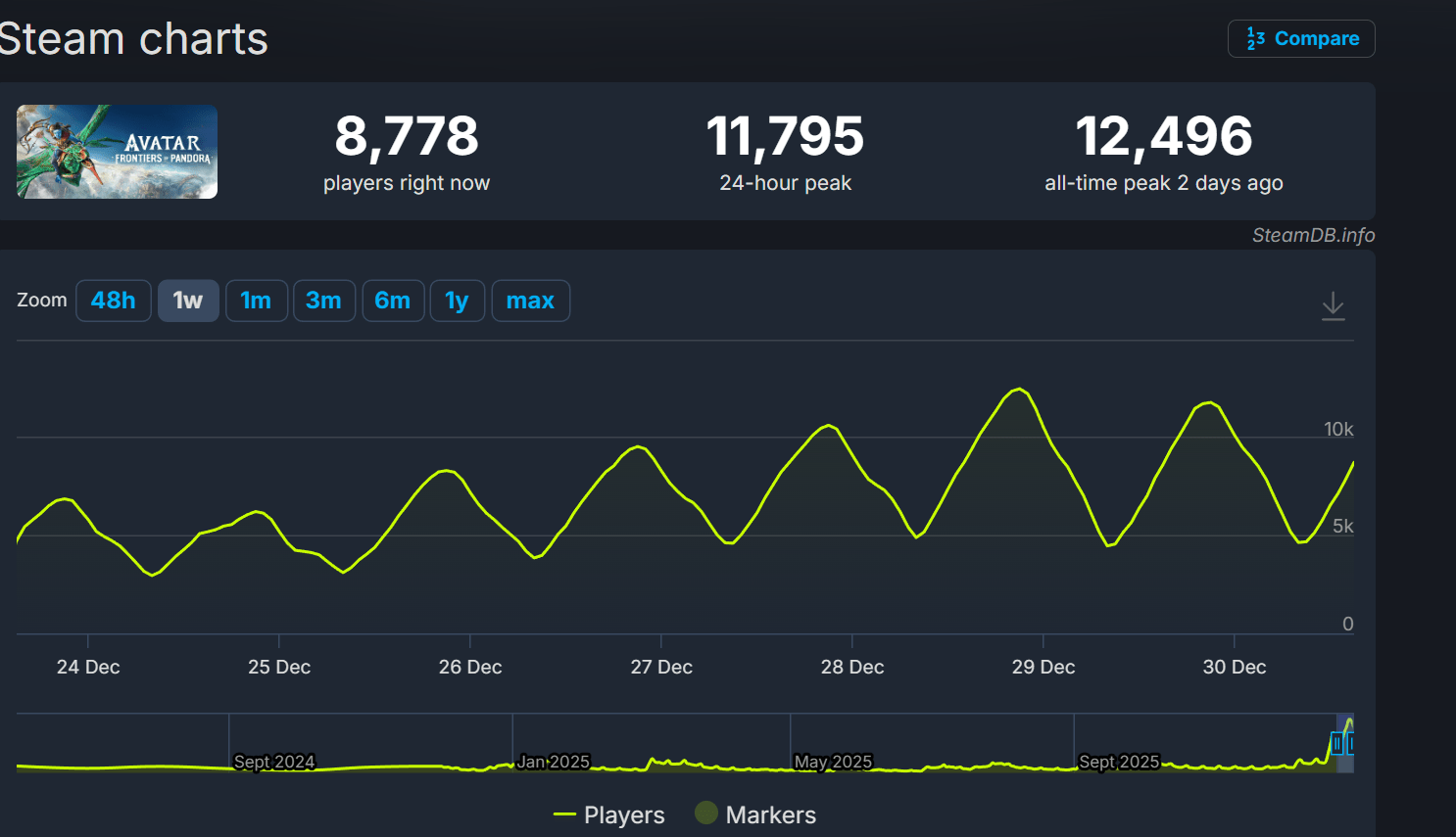 Antes de diciembre de 2025, el récord de jugadores simultáneos de Frontiers of Pandora en Steam era de 2.614 jugadores, una cifra bastante discreta que se mantuvo durante meses. Pues bien, el juego no solo ha estado superando ese número consistentemente durante las últimas semanas, sino que ha alcanzado un récord histórico de 12.496 jugadores simultáneos el pasado 28 de diciembre. Ahora mismo, mientras escribo esto, hay más de 8.700 personas jugando, con picos diarios que rondan los 11.000-12.000 jugadores. Una locura.