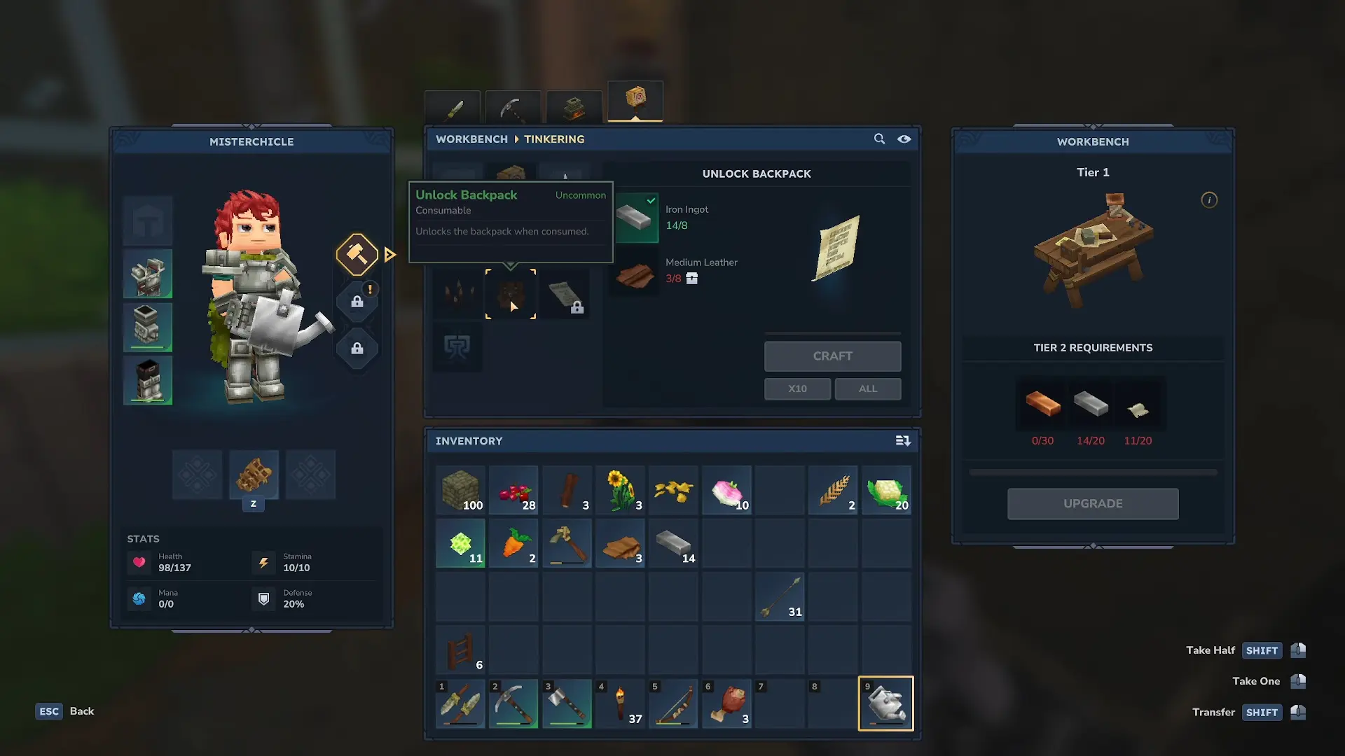 La Backpack se puede mejorar a nivel dos para que podamos tener todavía más espacio en el inventario. Para ello, solo tendremos que acercarnos de nuevo a la mesa de crafteo y arrastrar el ratón sobre la receta que se encuentra justo a la derecha de la mochila base. En ese momento se nos pedirán tres ingredientes: