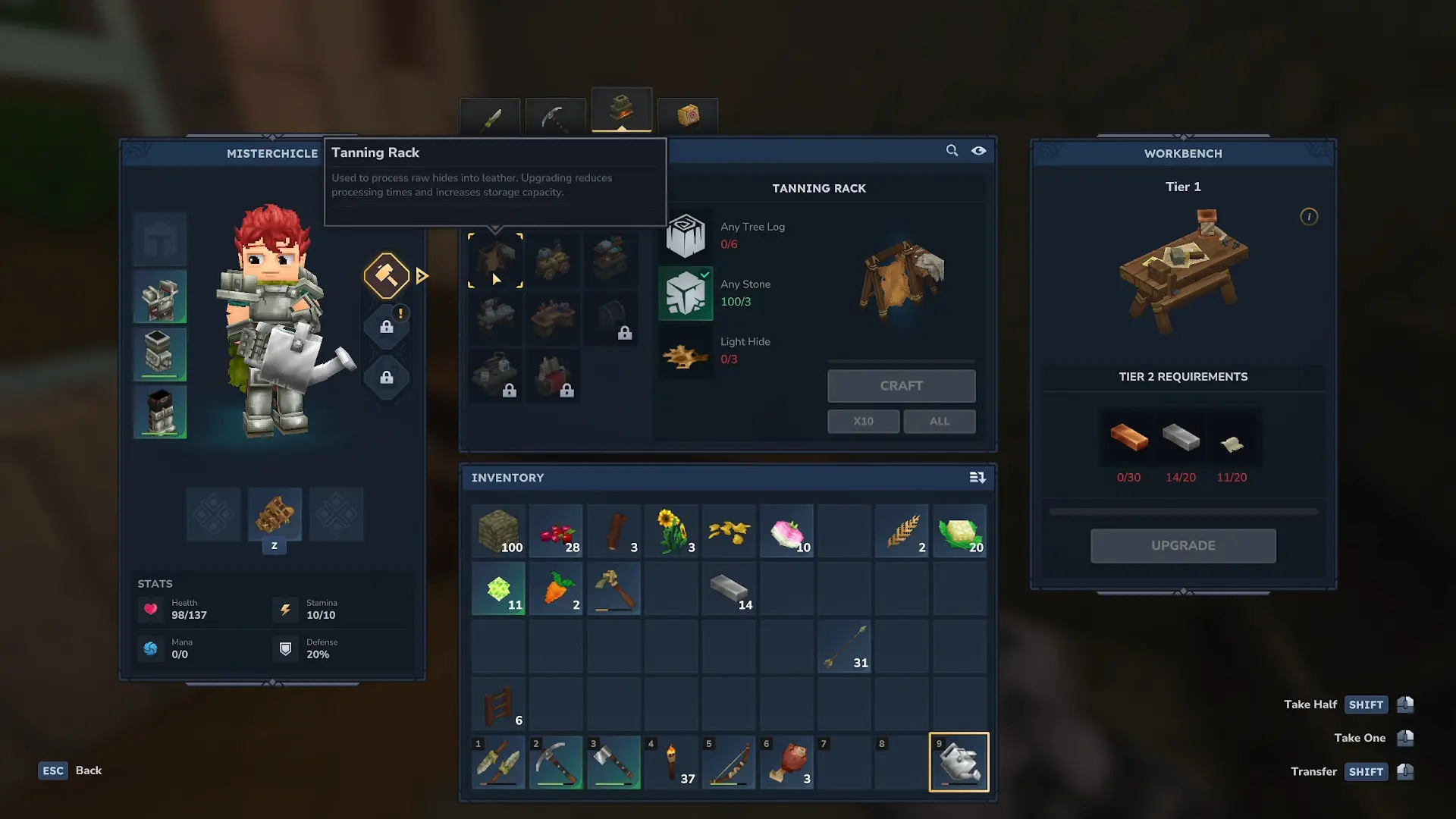 Una vez tengamos suficiente, tendremos que crear un Tanning Rack utilizando 6 bloques de madera, 3 de piedra y 3 de Light Hide, que se obtiene eliminando a animales pequeños como cerdos, conejos, cabras, ovejas o ciervos. Cuando hayas crafteado este ítem y lo pongas sobre el terreno, podrás introducir allí cualquier Hide (piel) y convertirla en su correspondiente Leather (cuero).