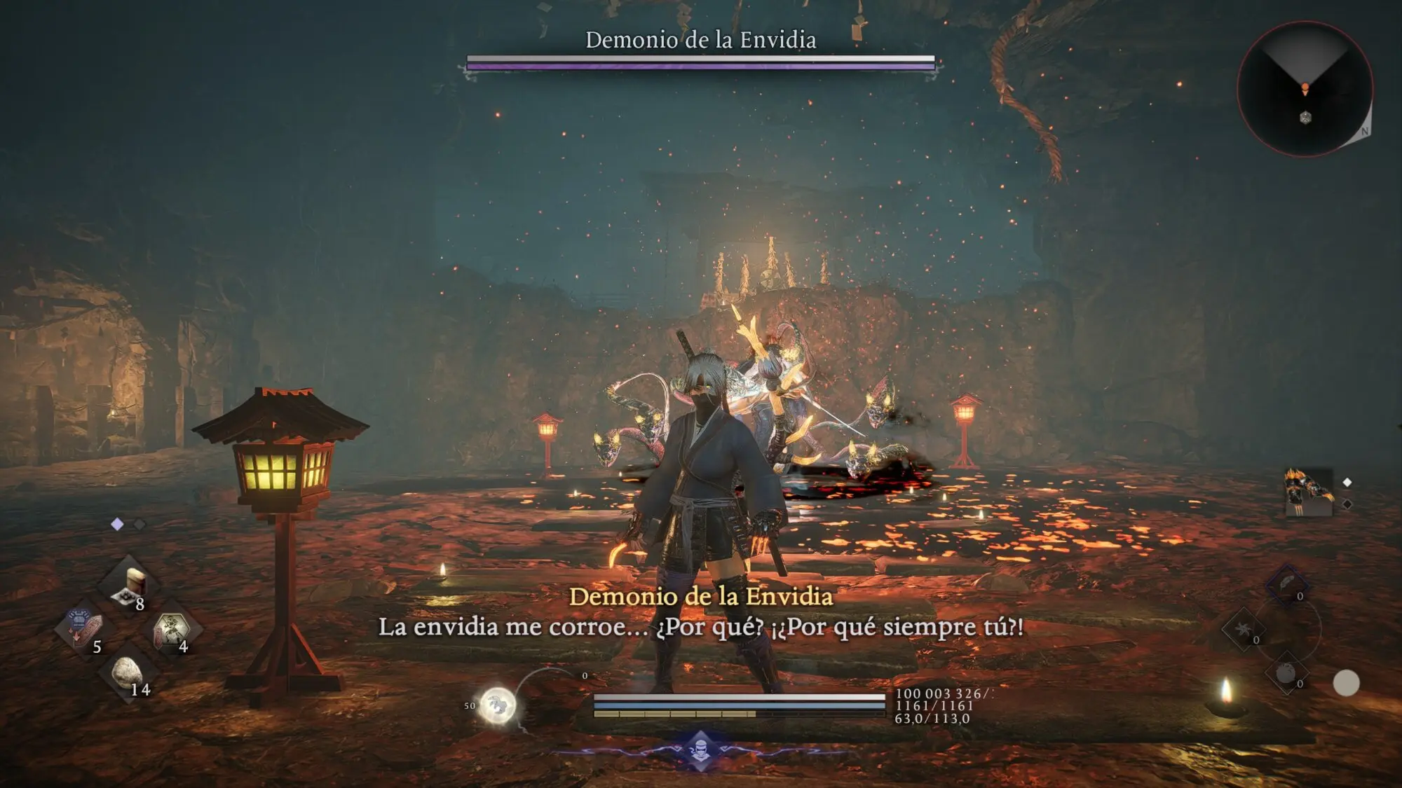 💡 Consejo Pro: El Demonio de la Envidia es una prueba de paciencia y timing perfecto. Sus ataques rápidos castigan cualquier momento de codicia — conecta 2-3 golpes máximo, luego sal inmediatamente. Los Burst Breaks son tu herramienta principal para controlar el ritmo — practica el timing hasta dominarlo. La clave es mantener disciplina: esquiva limpia → golpe breve → retrocede → repite. Si pierdes control del ritmo, usa Arma Viviente para resetear la pelea a tu favor. Venir post-historia con nivel 100+ convierte esta pelea de pesadilla brutal a desafío manejable — la diferencia es abismal.