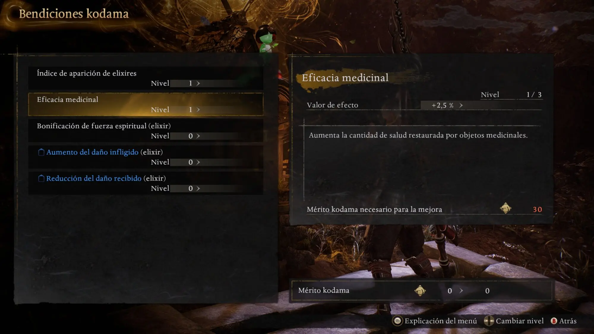 Puedes usar Mérito Kodama en el menú de Bendiciones Kodama en santuarios e intercambiarlo por varios buffs relacionados con elixires para usar en cualquier momento.