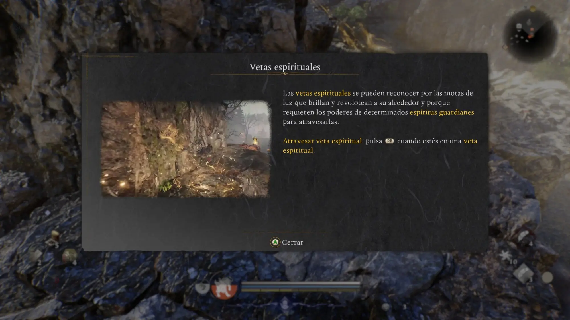 Durante tu exploración, a veces estarás bloqueado para progresar por un acantilado demasiado alto para saltar, un desfiladero infranqueable, una roca, etc., que están marcados con partículas brillantes. Estos se llaman Vetas Espirituales.