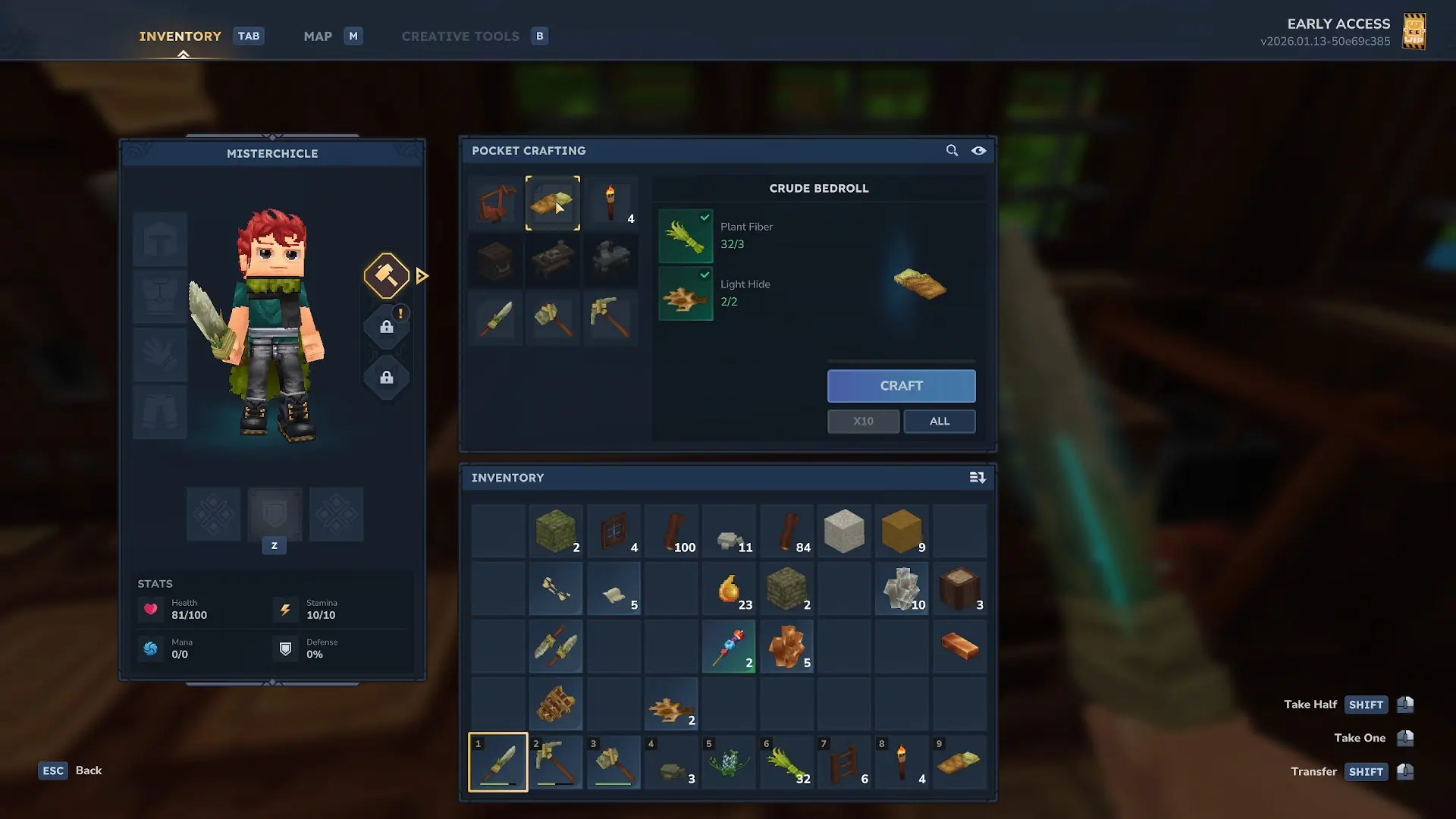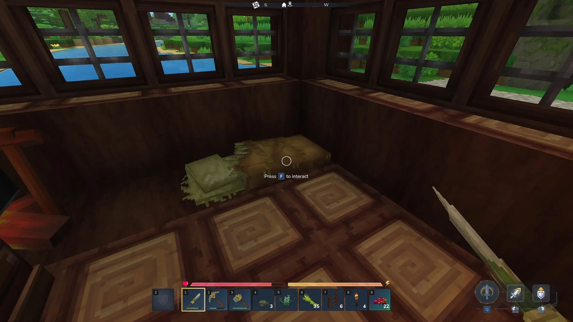 Teniendo 3 de Plant Fiber y 2 de Light Hide en vuestro inventario, podréis crear una cama desde el menú de crafteo rápido que encontraréis dentro del mismo. Debéis tener en cuenta que la cama ocupa dos bloques y, una vez la pongáis, podréis utilizarla tanto como para setear un punto de respawn como para dormir por las noches y hacer que el tiempo pase rápidamente.