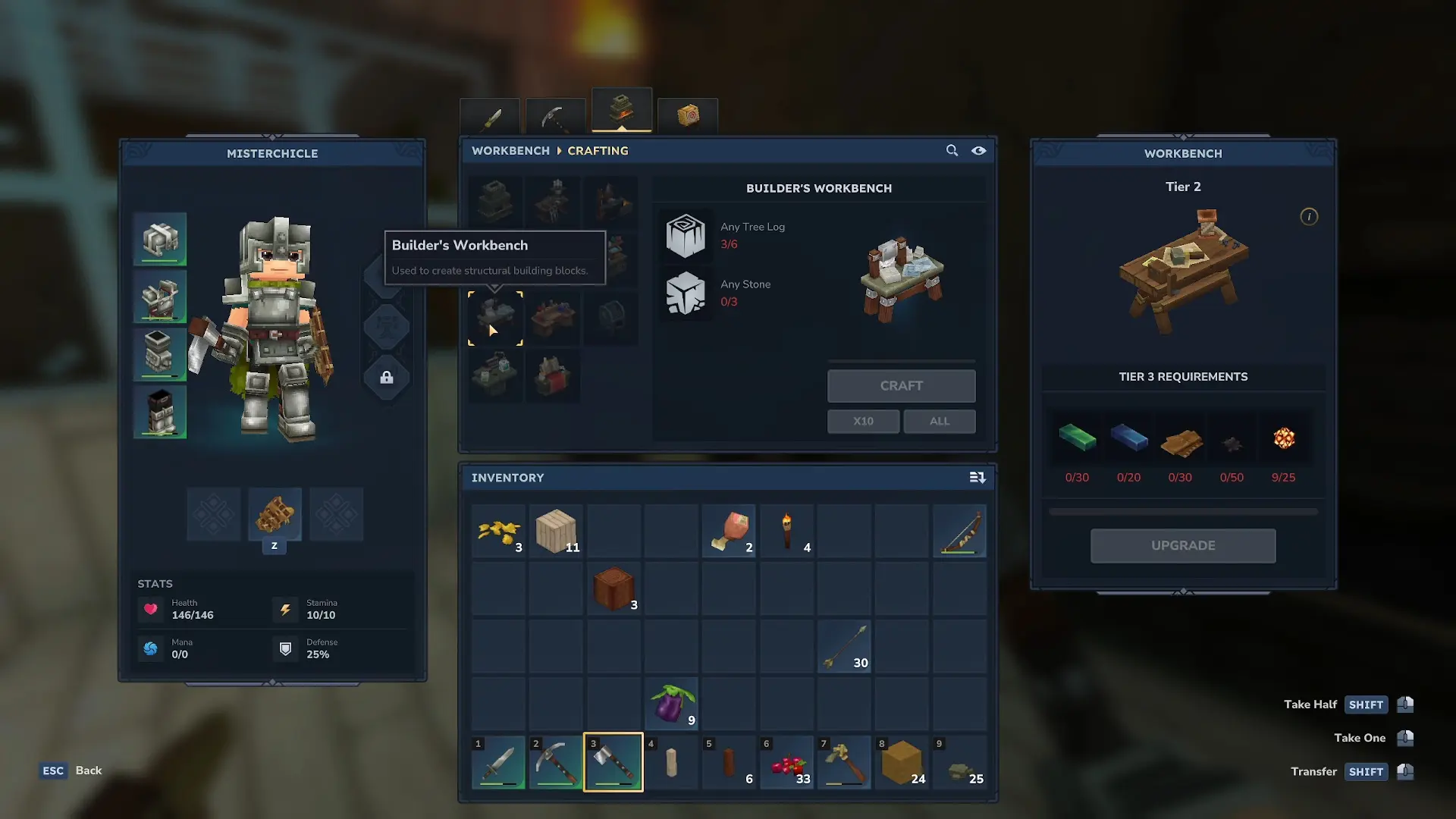 • Paso 2: recoge madera y fabrica 19 beams en la Builder's Workbench. Lo ideal es que hagas beams de colores distintos usando dos maderas diferentes (15 de una y 4 de otra)