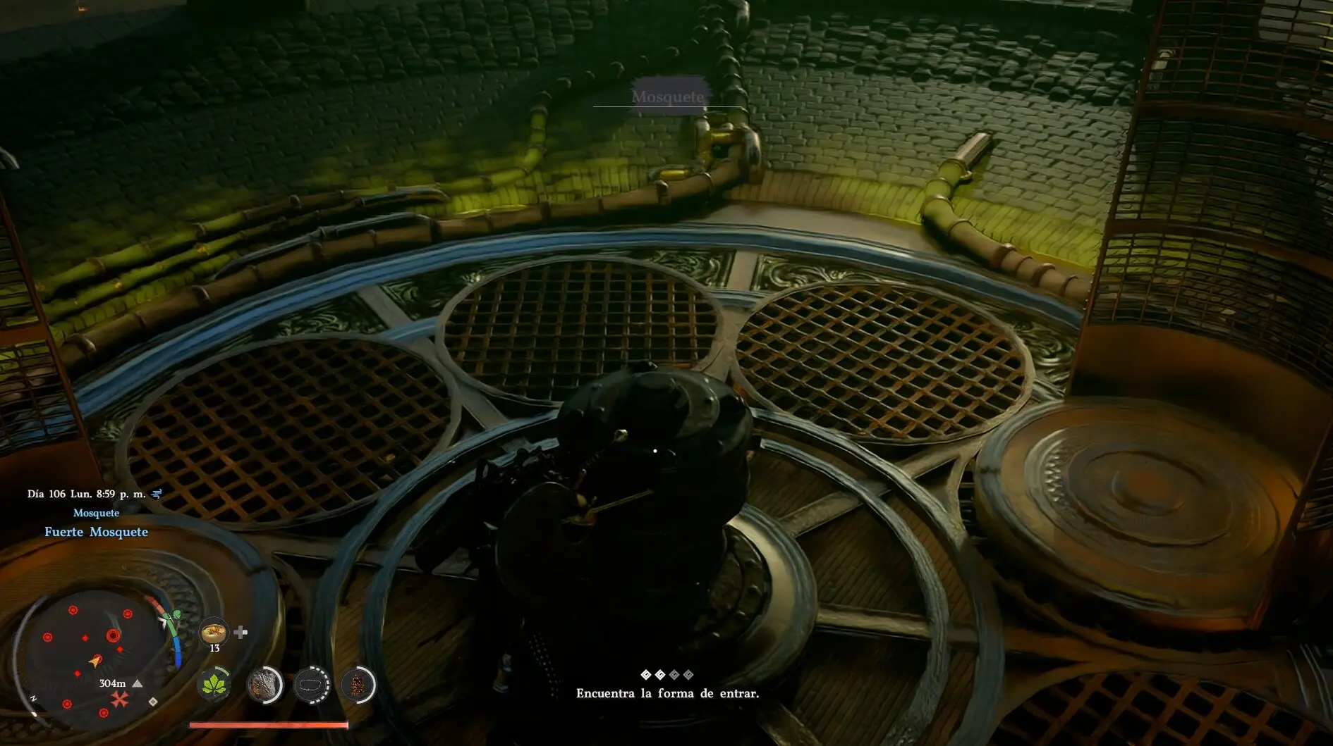 Nada más entrar verás un pilar central redondo frente a ti pero sin ninguna salida visible hacia arriba. Usa la habilidad Estocada (R1+Triángulo / R1+Y) para clavar tu arma en el pilar y convertirlo en una palanca. Empuja para girar el pilar hasta que la rejilla abierta del techo quede alineada con el hueco del suelo. Una vez alineadas, sube usando tres Palmas de Fuerza consecutivas en el aire (salta y pulsa R3 tres veces).