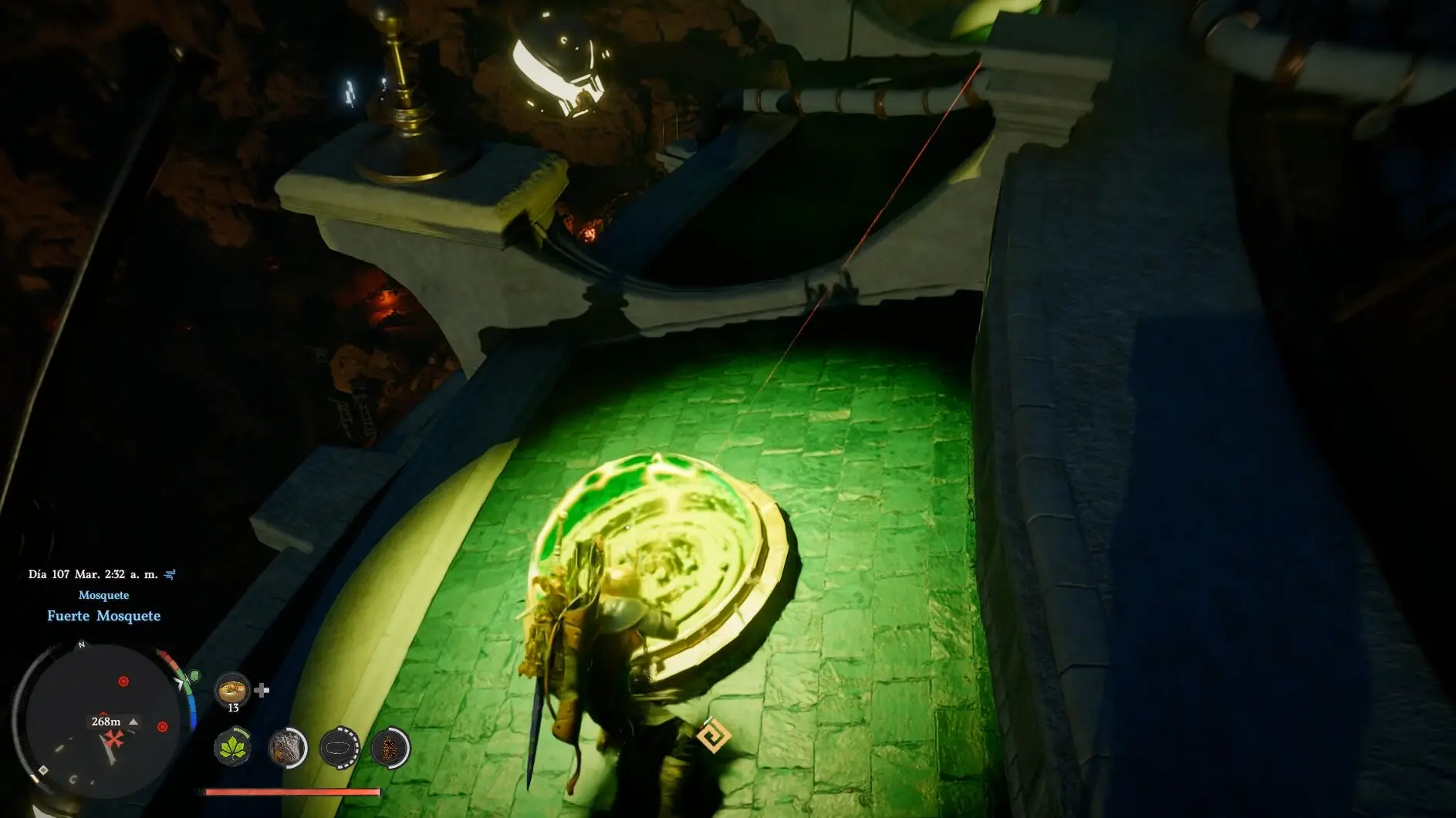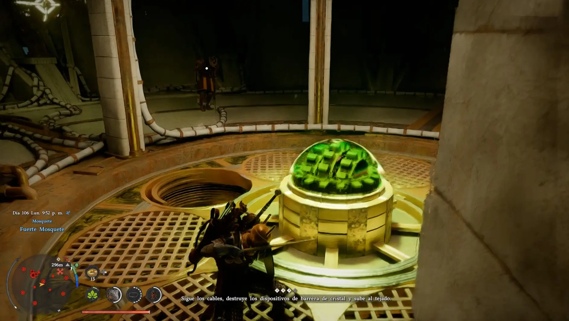 En el centro del tejado hay otro dispositivo de cristal verde. Usa la Estocada para destruirlo igual que el anterior. Al hacerlo se abre una puerta en el lado sur de la fortaleza.