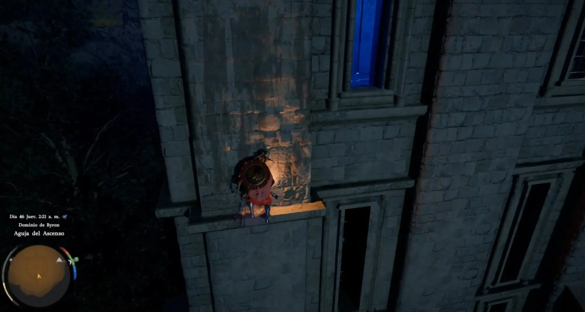 2. Hay dos formas de entrar Opción A: Escala la torre por el exterior hasta encontrar una de las grandes entradas circulares a media altura. Hay puntos de descanso en el camino para recuperar aguante. Opción B: Mira hacia la derecha de la torre, abajo del acantilado. Hay un túnel minero oculto que lleva directamente al sótano de la Aguja
