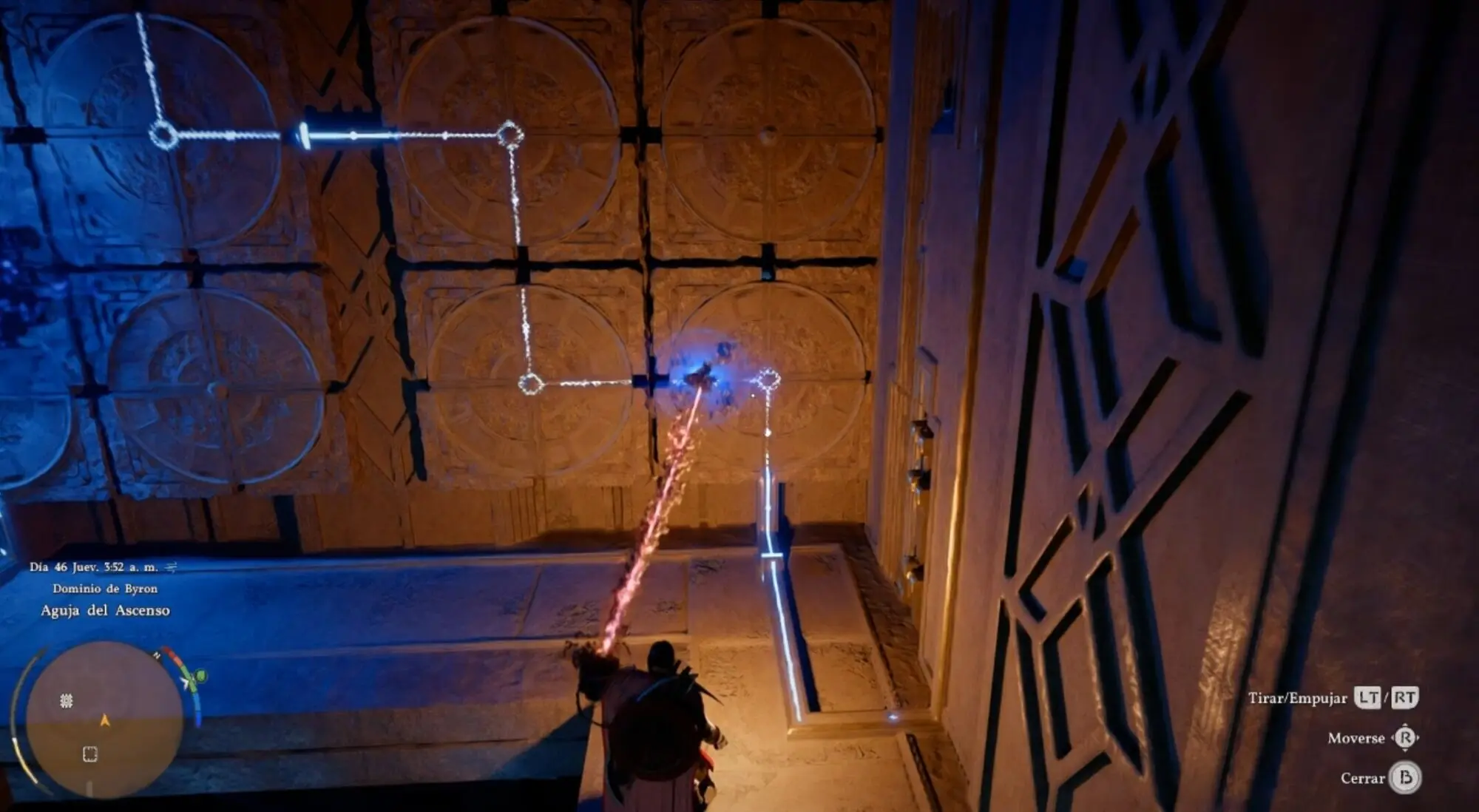 💡 Consejo: La rotación con Fuerza Axiomática puede ser torpe al principio. Gira el stick despacio para alinear los paneles con precisión. Si te caes durante la subida, no te preocupes: el estado de los puzles se guarda y no tienes que repetir las rotaciones. Puedes volver a usar el ventilador del sótano para subir.