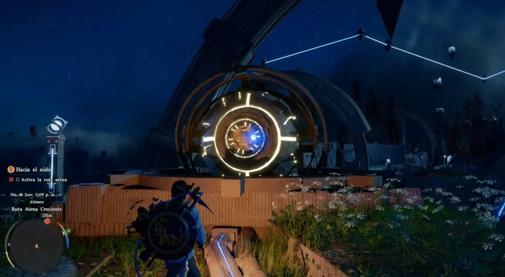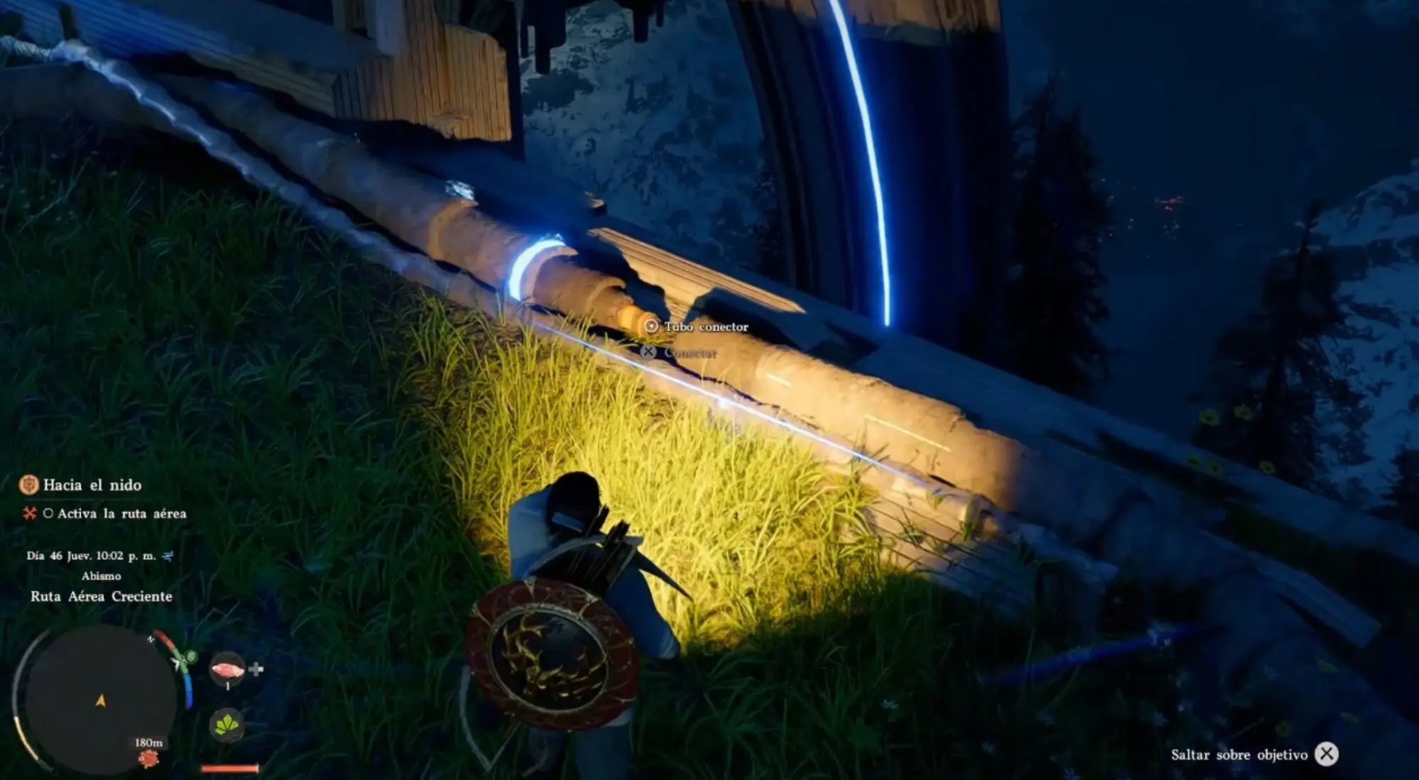 Una vez activado el Puente Celeste, sube por el panel y sigue el camino hacia el marcador del objetivo. Pasa por el portal triangular y un interruptor saldrá del suelo: agárralo con Fuerza Axiomática y usa la cruceta para encontrar el punto exacto. Esto generará plataformas que te permitirán avanzar. Usa los generadores de viento para impulsarte hacia arriba planeando hasta la plataforma final, donde te espera un teletransportador azul en el suelo. Al pisarlo te llevará a la zona del Invocacuervos.