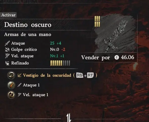La Destino Oscuro destaca sobre cualquier otra espada de una mano disponible en ese punto del juego por una razón muy concreta: llega ya refinada a nivel 6, lo que normalmente requeriría invertir dos Artefactos del Abismo.