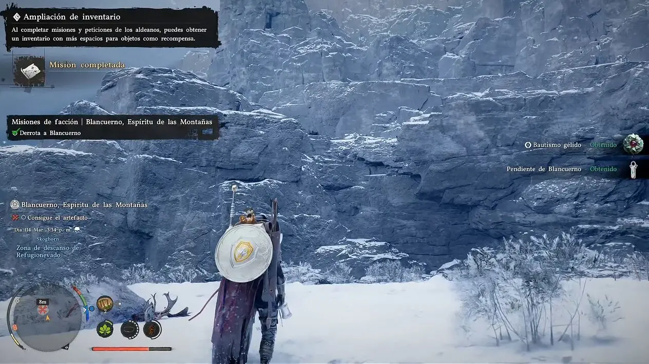 3 Completa la cadena hasta desbloquear la misión Blancuerno, Espíritu de las Montañas y dirígete a la Zona de descanso de Refugionevado