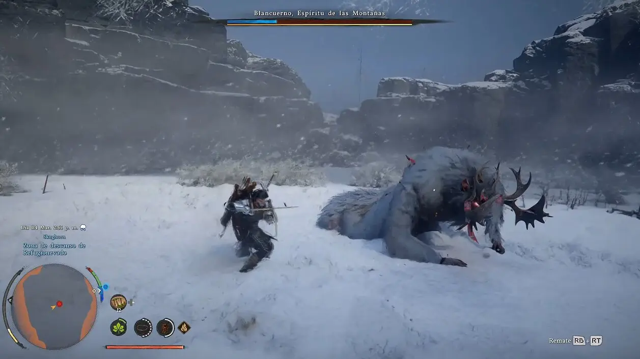 💡 Consejo: El Golpe Llameante es el truco que convierte este combate de una pesadilla en algo asumible. Cada vez que le prendas fuego, Blancuerno cae al suelo y se revuelca intentando apagarse. Ese momento es tu ventana de daño gratuito: suéltale el Corte Giratorio y todo el daño que puedas antes de que se recupere y repite el ciclo. Sin esta habilidad, el combate dura el doble y es mucho más peligroso.