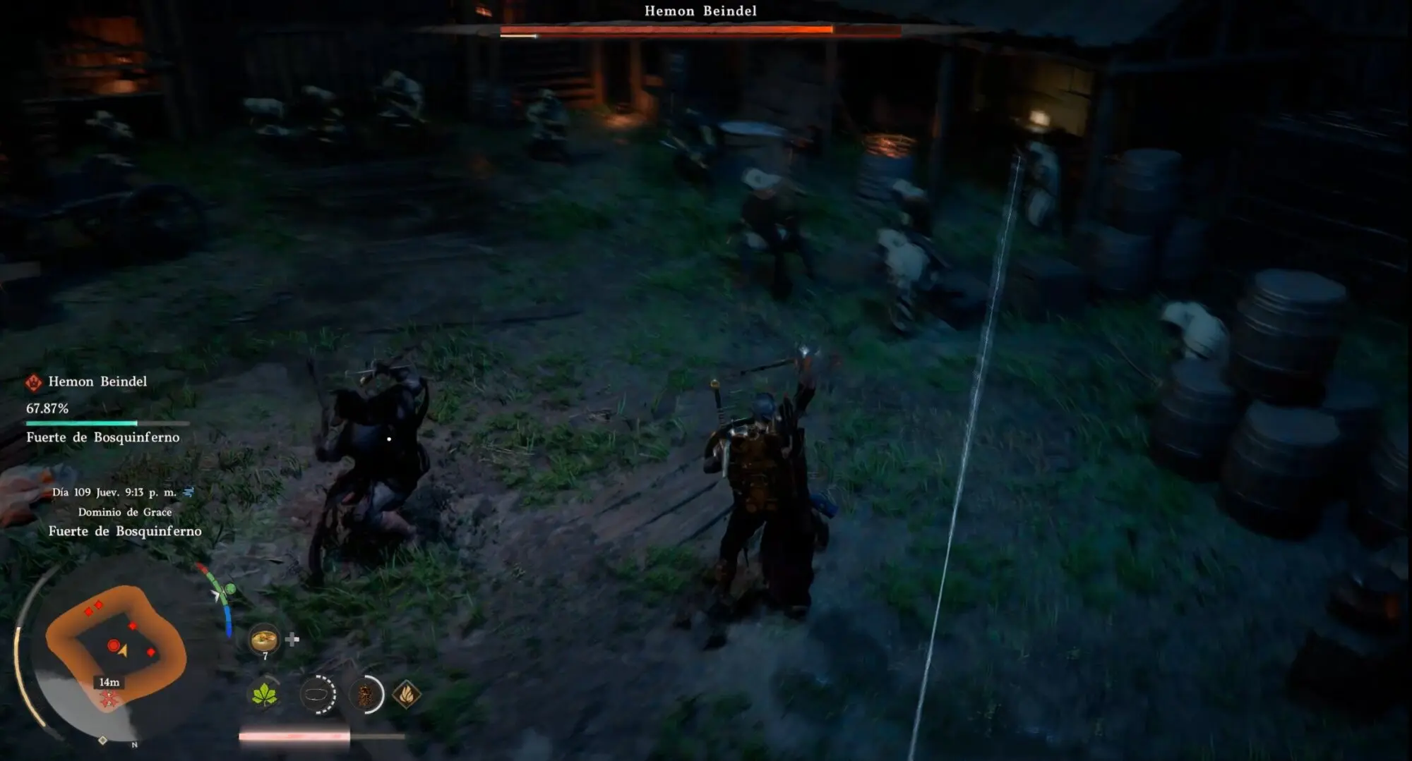 El combate con Hemon Baindel tiene una dinámica clara: él busca meterse dentro de tu guardia con el combo de cuchilladas, y tú tienes que decidir si lo pareas o si esquivas y buscas ventanas para contraatacar. El Modo de Concentración es tu mejor herramienta aquí: actívalo con L3+R3, espera a que cargue el ataque y para con L1 justo antes del impacto. Cuando lo logres, tienes una ventana corta para meterle daño limpio. Repite ese ciclo unas pocas veces y el combate se acaba sin mayor problema.