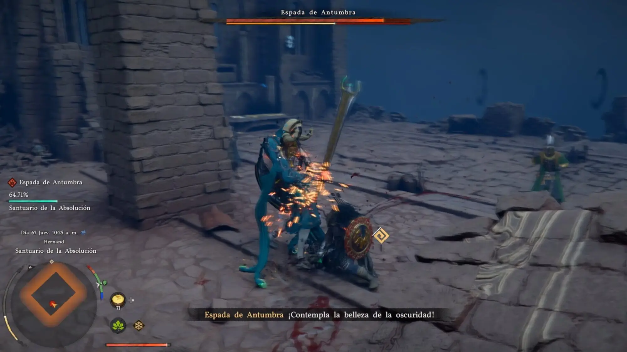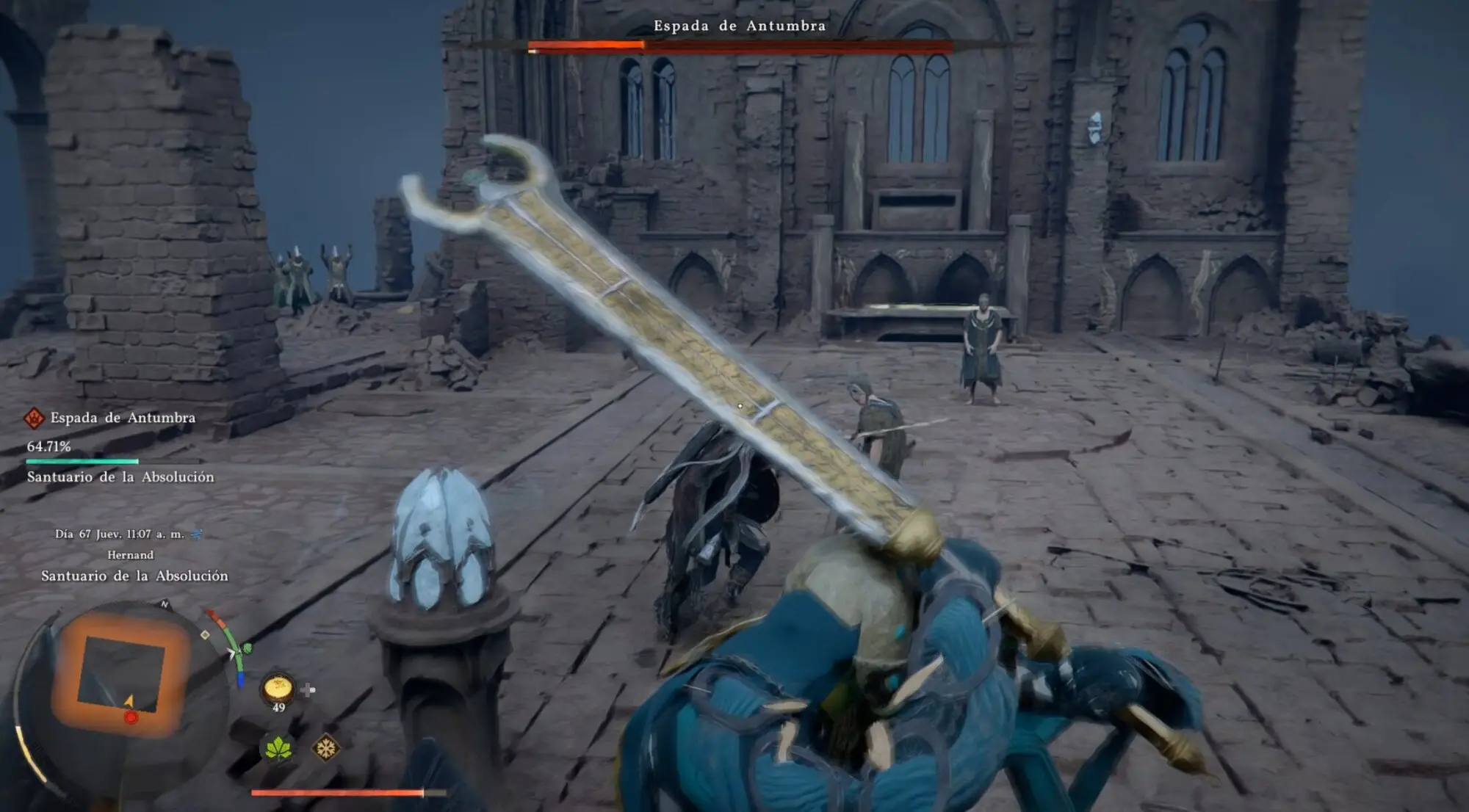 La Espada de Antumbra es un jefe opcional de facción que encontrarás en el Santuario de la Absolución, en la región de Hernand. Forma parte de la cadena de misiones de la facción de las Brujas (Claustro de la Ruina) y es uno de los jefes opcionales más complicados del juego: se teletransporta constantemente, invoca apariciones que atacan a la vez que él y lanza oleadas de espada que cubren medio campo de batalla. Si no llevas buen equipo y no sabes cuándo esquivar, te puede liquidar en dos golpes.